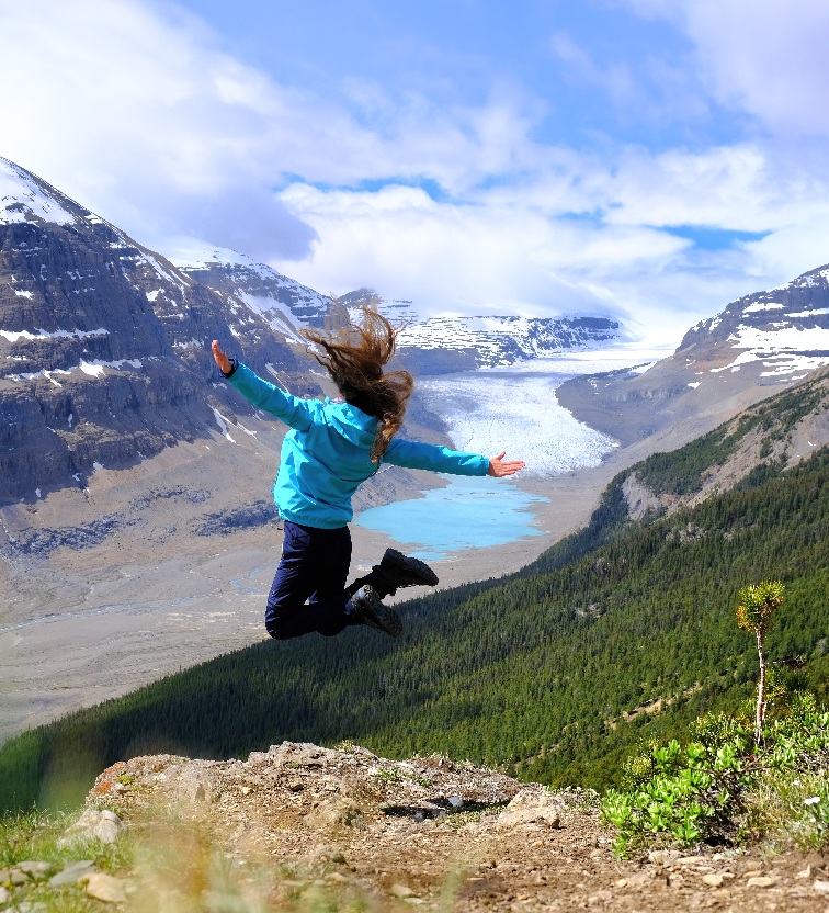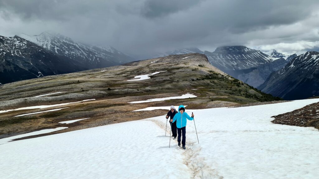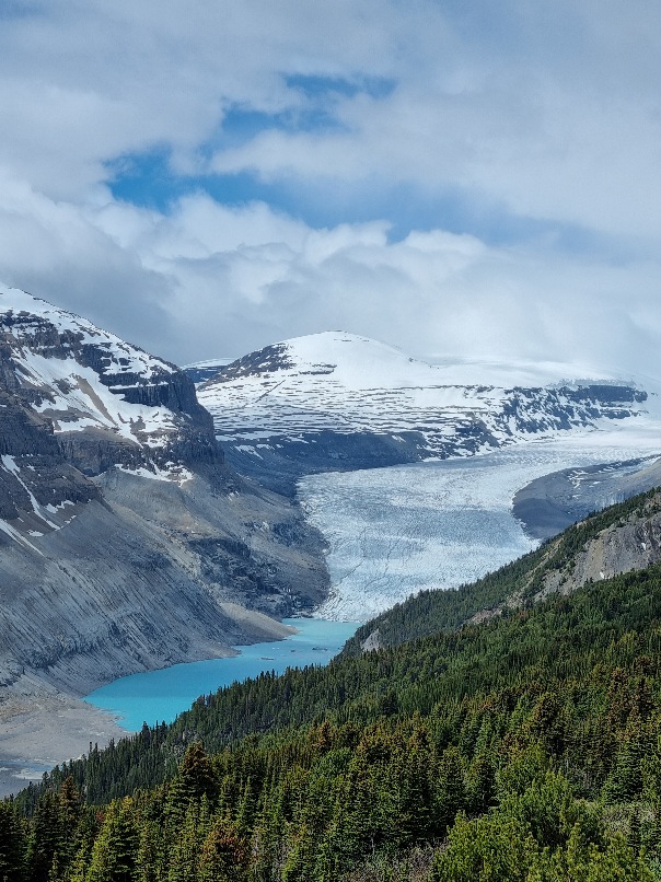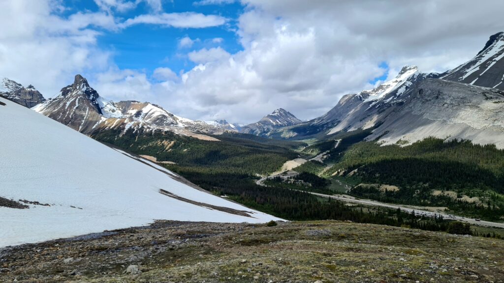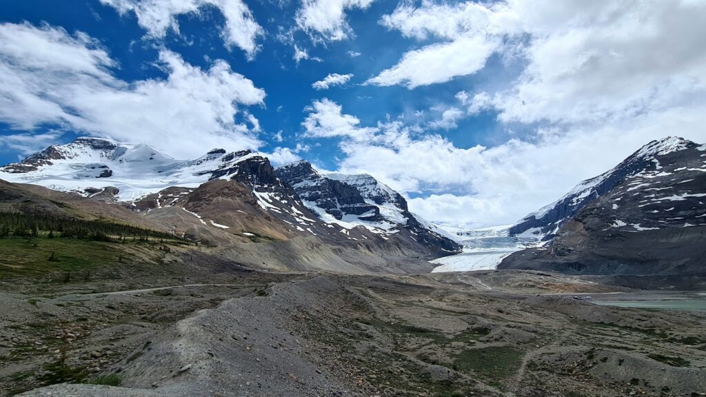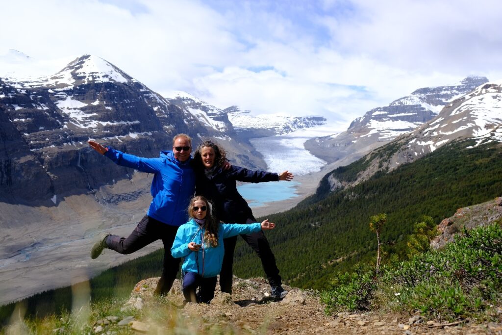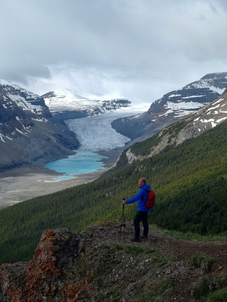 Nach 1/3 des Weges konnten wir die Capes wieder in die Rucksäcke verstauen und das Wetter klarte immer mehr auf. Da wir 2Tage ohne Netz waren konnten wir uns im Vorfeld nicht genau über die Wanderung informieren und wussten auch nicht was uns erwartet. Wir stapften auf matschigen Wegen in Serpentinen bergauf und uns wurde von entgegenkommenden Wanderern ein „Happy Canada Day“ und eine tolle Aussicht gewünscht. Oben angekommen konnten wir die Aussicht kaum fassen. Wir bestaunten den Saskatchewan Gletscher.