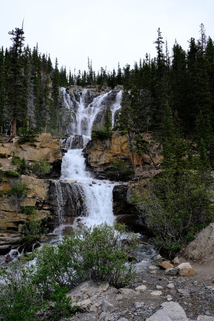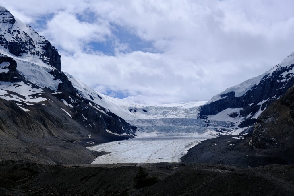 Da es dort oben sehr windig war hielten wir es nicht lange aus und traten recht hungrig den Rückweg an. 14.30 gab es dann eine Suppe im Camper und wieder gings auf den Icefields Parkway. Die Fahrt dauerte nur kurz und wir hielten am Aussichtspunkt zum Athabasca Gletscher und den Tangle Creek Falls.