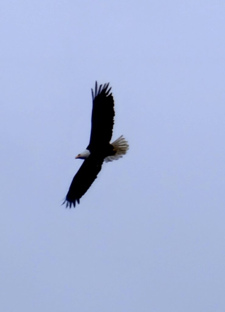 Als wir am Aussichtspunkt ankamen entdeckte Holger einen Weißkopfseeadler. Während Holger und Mariella mit den Fernglas schauten, versuchte ich ein Foto zu knipsen. Teilweise ist es gelungen.