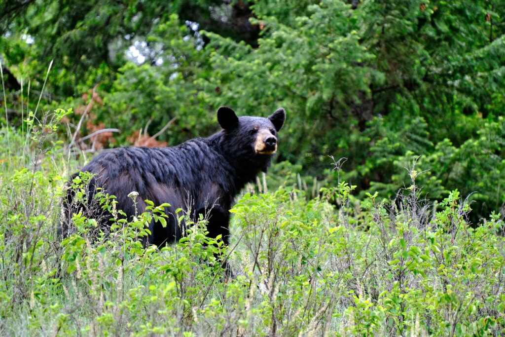 Am 3.See kamen uns Wanderer entgegen und meinten es gäbe einen Bär auf dem Berg. Aufmerksam liefen wir weiter und entdecken ihn oberhalb des Weges ca 30m von uns entfernt. Der Schwarzbär witterte uns, kam jedoch nicht auf uns zu. Wir unterhielten uns recht laut, knipsten ein paar Fotos und dann lief der Bär weiter in den Wald hinauf. Uns entgegenkommende Wanderer hielten ihr Bärenspray griffbereit (wir hatten noch nicht mal daran gedacht es in die Hand zu nehmen – waren wir zu leichtsinnig?)