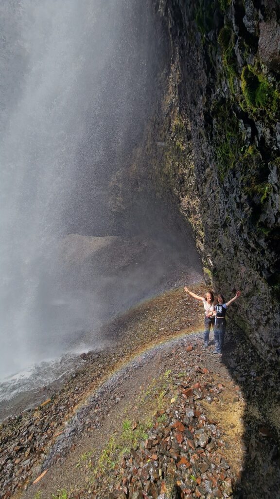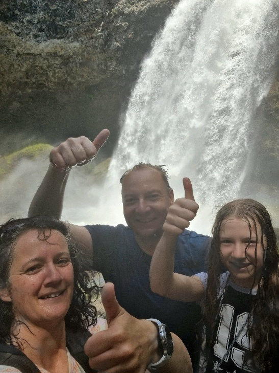 Gestärkt fuhren wir weiter zum Parkplatz, an dem die Wanderung zu den Moul Falls startet. Ich hatte gelesen, dass man sich auch unter den Wasserfall stellen kann, also los geht’s. Der Weg dorthin war recht einfach. Zunächst dachten wir, einen Abzweig verpasst zu haben, fanden dann den richtigen Weg und stiegen über Treppen hinab zum Fuße des Wasserfalls. Beeindruckend rauschte er in die Tiefe, überall schimmerten Regenbögen. Nun nahmen wir unseren Mut zusammen und wagten uns teilweise unter den Wasserfall, dabei wurden wir klitschnass. Bei Temperaturen über 25Grad störte es nicht und wir trockneten auf dem Rückweg zum Camper wieder ab. Ein tolles Abenteuer war das.