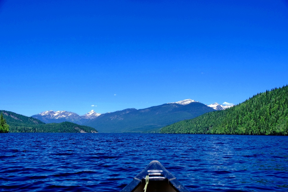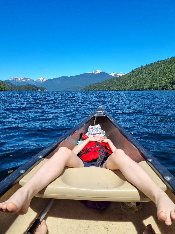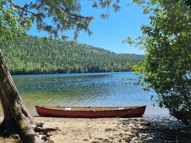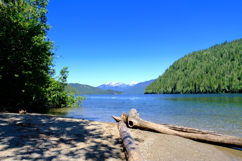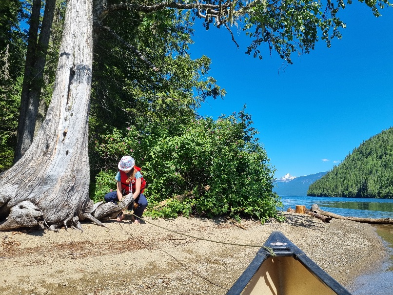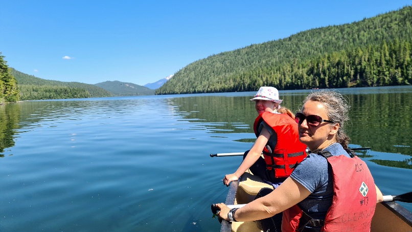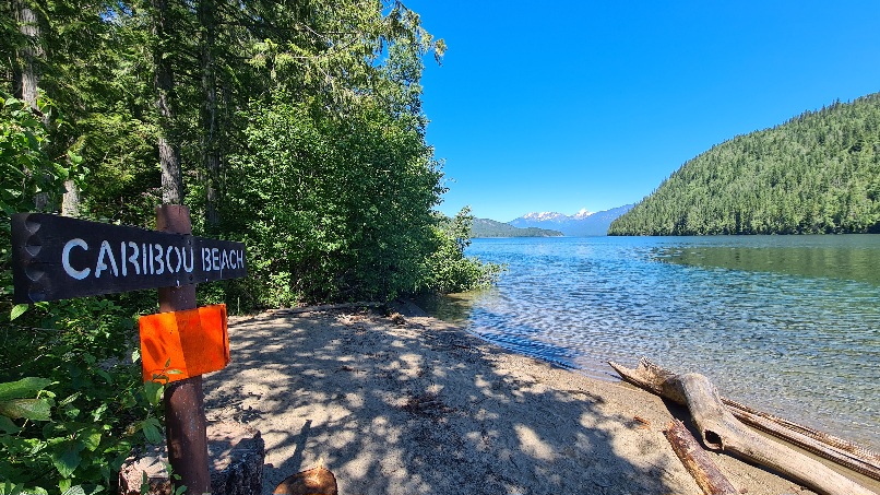 Wir haben den ganzen Tag das Kanu zur Verfügung und können damit auf dem gesamten Clearwater Lake paddeln. Der ist so groß, dass man das ganze auch als Mehrtagestour und Zeltübernachtung machen kann. Wir paddelten leise am Ufer entlang, um ggf. doch noch einen Elch oder einen weiteren Bären zu sehen. Nach ca. 1,5 Stunden kamen wir am tollen, kleinen Strand „Caribou Beach“ an. Hier konnte man an Land gehen, sein Kanu fest machen und die Ruhe genießen. Einen Picknickplatz gab es dort auch. Mariella und ich waren an diesem tollen Fleckchen baden. Holger genoss die tolle Aussicht auf Wasser und umliegende Wälder und schneebedeckte Berge.