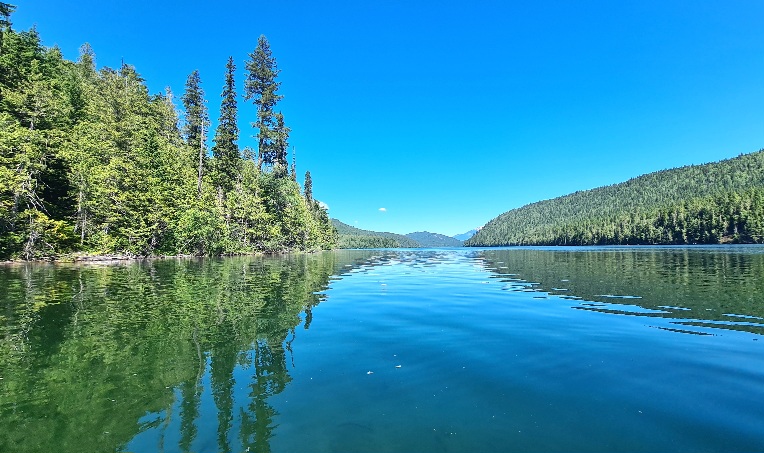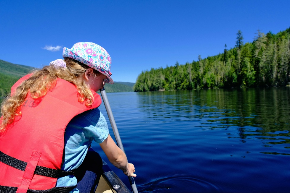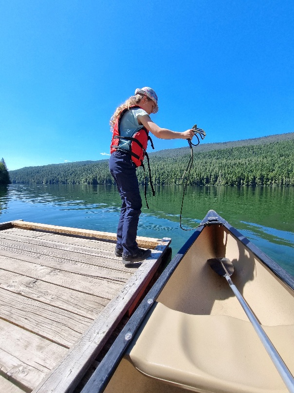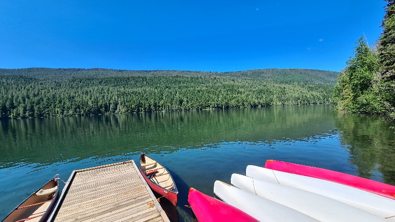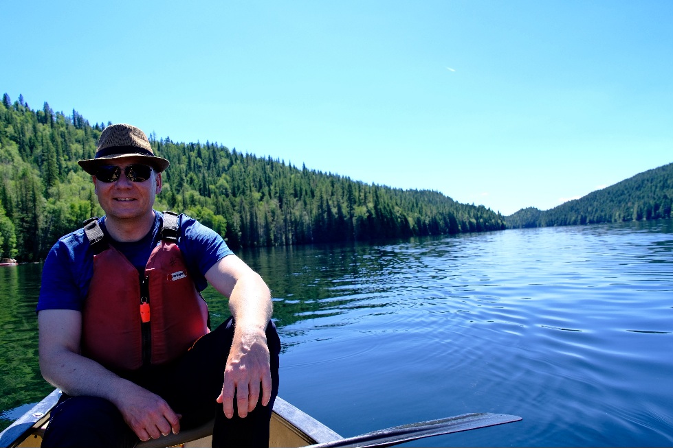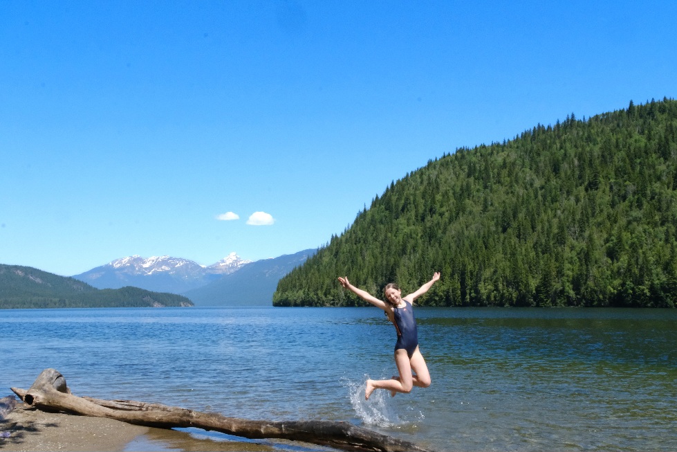 Wir haben den ganzen Tag das Kanu zur Verfügung und können damit auf dem gesamten Clearwater Lake paddeln. Der ist so groß, dass man das ganze auch als Mehrtagestour und Zeltübernachtung machen kann. Wir paddelten leise am Ufer entlang, um ggf. doch noch einen Elch oder einen weiteren Bären zu sehen. Nach ca. 1,5 Stunden kamen wir am tollen, kleinen Strand „Caribou Beach“ an. Hier konnte man an Land gehen, sein Kanu fest machen und die Ruhe genießen. Einen Picknickplatz gab es dort auch. Mariella und ich waren an diesem tollen Fleckchen baden. Holger genoss die tolle Aussicht auf Wasser und umliegende Wälder und schneebedeckte Berge.