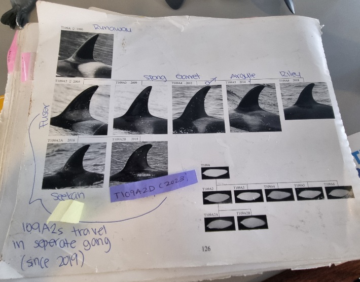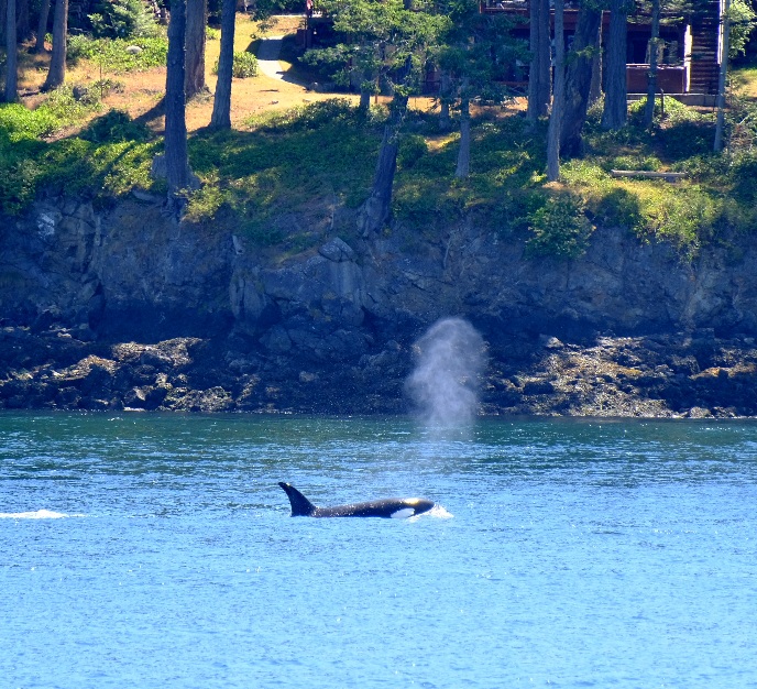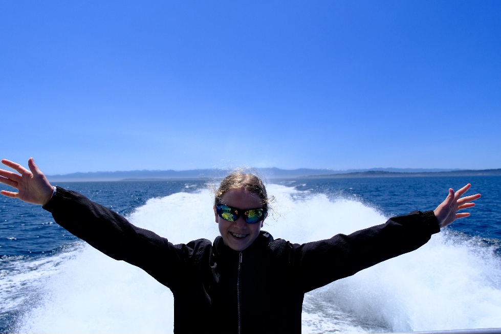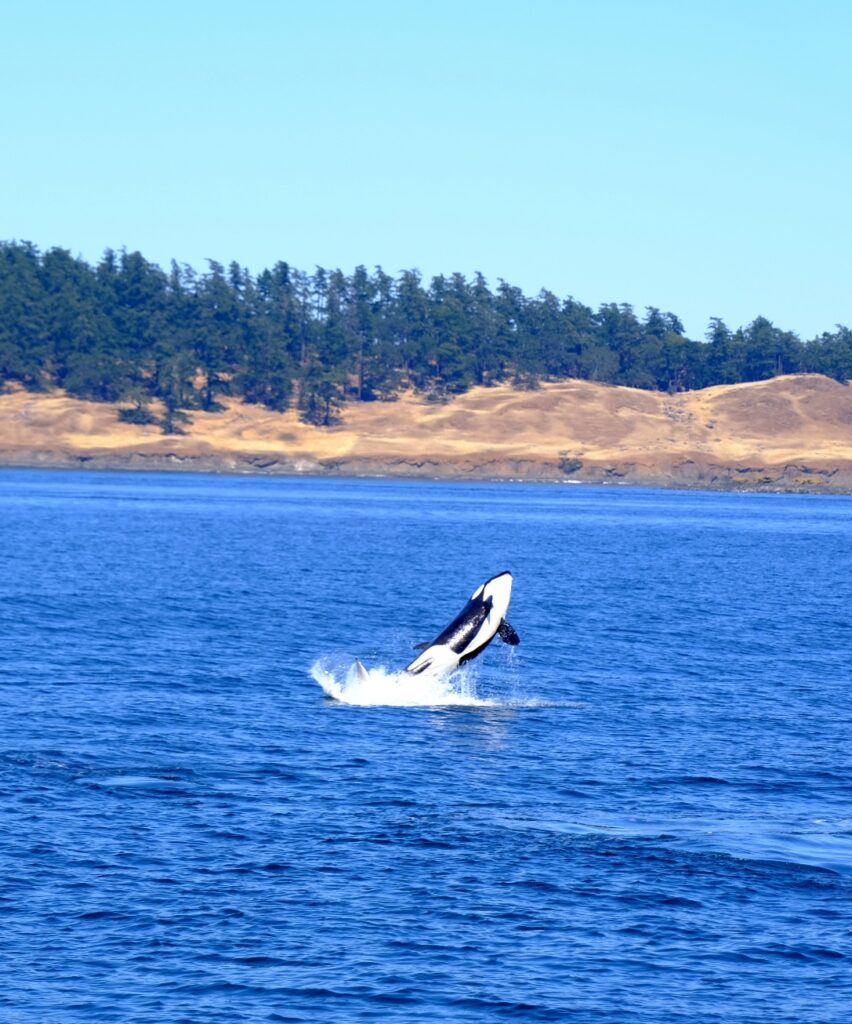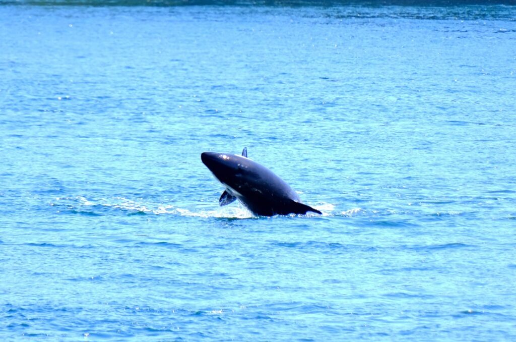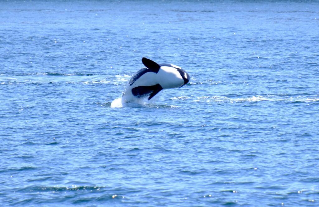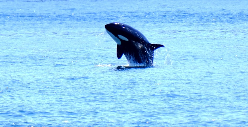 Nach ca 1Stunde Fahrt stoppte das Boot und wir sahen die Orcas bereits von weitem. Langsam näherten wir uns etwas an und dann wurde der Motor abgestellt. Wir beobachteten eine größere Orca-Familie. Sie drehten sich im Wasser, schauten neugierig die Boote an, prusteten Fontänen in die Luft und sprangen zur Freude aller Beobachter auch. Die Fotoapparate klackerten nur so – und ein „Oooh my god“ war in unterschiedlichen Tonlagen vermischt mit Jubel und Lachen von den Booten zu hören. Ein wahnsinnig tolles Erlebnis diese schönen Tiere zu beobachten. Die Familie schwamm sehr nah an unserem Boot vorbei (Orcas sind wohl sehr sozial und kommunikativ). An Board waren auch 2 Guides die über diese Familie gut Bescheid wusste, es gab wohl eine Großmutter, Kinder und Enkel in dieser Gruppe. Man kann sie wohl ganz gut an ihren Flossen erkennen.