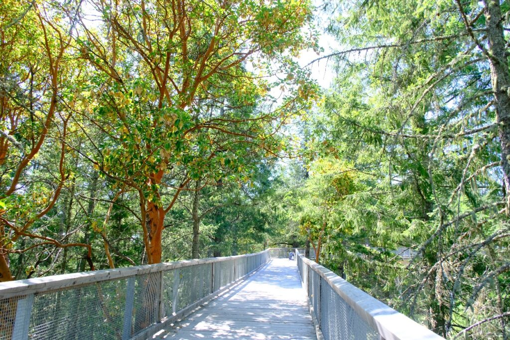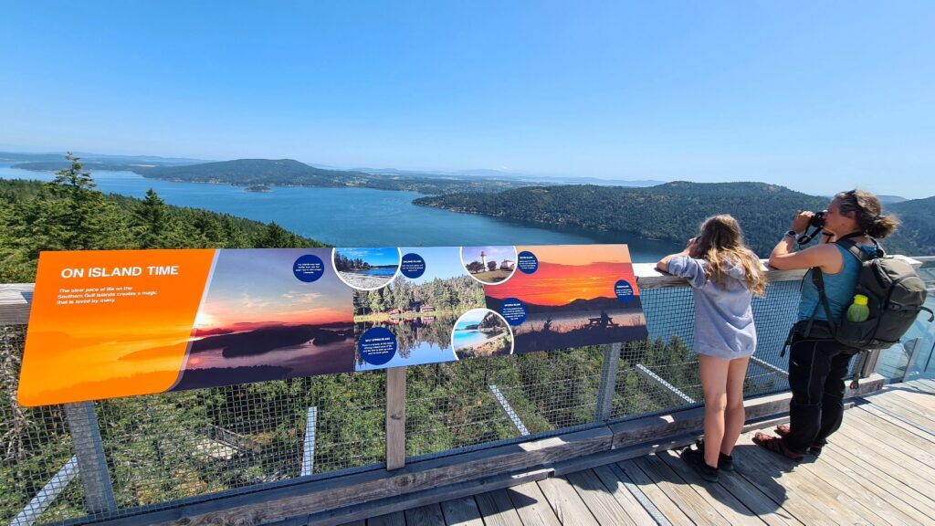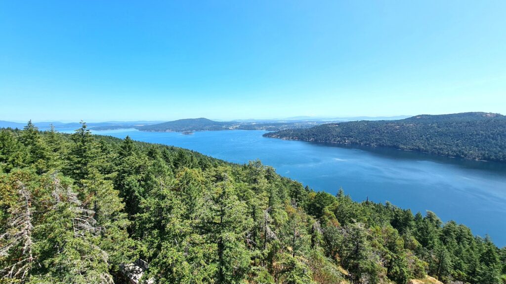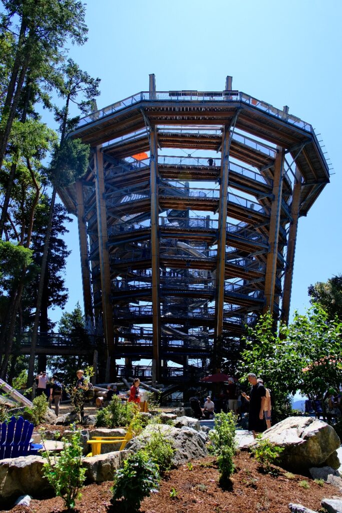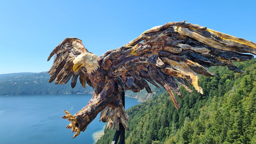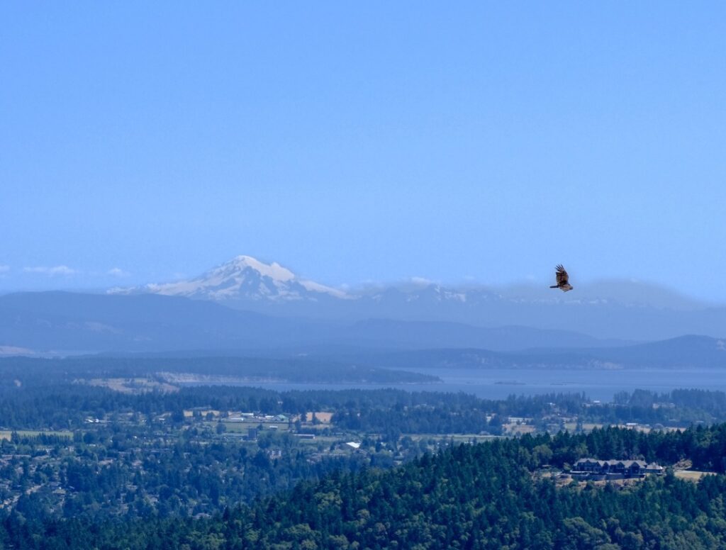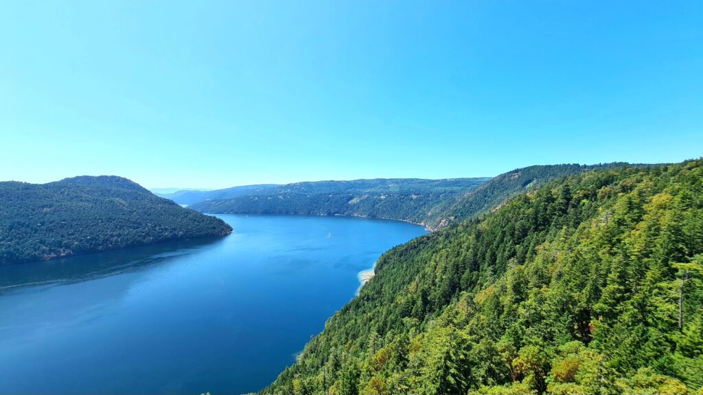 Der restliche Tag verlief entspannter. Nach einer kurzen Putz- und Aufräumaktion im Camper, machten wir uns auf zum Campingplatz nach Nanaimo. Dieser dient wieder nur als Zwischenstopp, bevor es morgen in den Regenwald und an den Strand geht (der Erholungsteil unseres Aktivurlaubs und leider schon der letzte Abschnitt). Auf unserer Strecke lag noch der Malahat SkyWalk. Ein kurzer Weg mit einer Wendelschleife in 50m Höhe mit tollem Ausblick auf das Indianergebiet der Malahat, mit viel Wald und durchzogen mit Fjorden des Pazifiks. Es gab viel über die Indigenen Völker zu lesen – bspw, dass es allein auf der Insel Vacouver Island 50 Stämme gab. Das ist für Holger höchstinteressant, der als Kind die Karl-May Bände verschlungen hat. Mariella und Claudi entlockt es dann immer ein „ach der Papa wieder und seine Indianer….“ Wir beobachteten verschiedene Vögel, unter anderem auch wieder Adler. Von oben konnten wir einen Blick in die USA werfen. Der Baker-Mountain im US Bundesstaat Washington leuchtet mit seinem vielen Schnee und Eis im Hintergrund. Er ist ein eisbedeckter Vulkan und 3286m hoch und liegt im schneereichsten Gebiet der Welt. Den Rekord hält der Winter 2000, da hat es 28m neuen Schnee gegeben (unvorstellbar oder?). Die Berge lassen uns einfach nicht los…