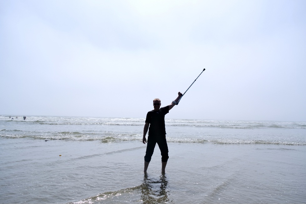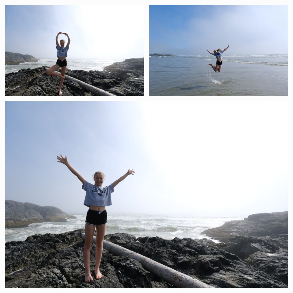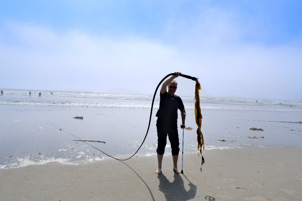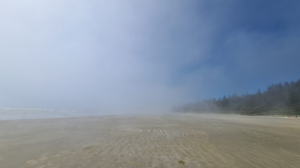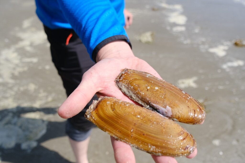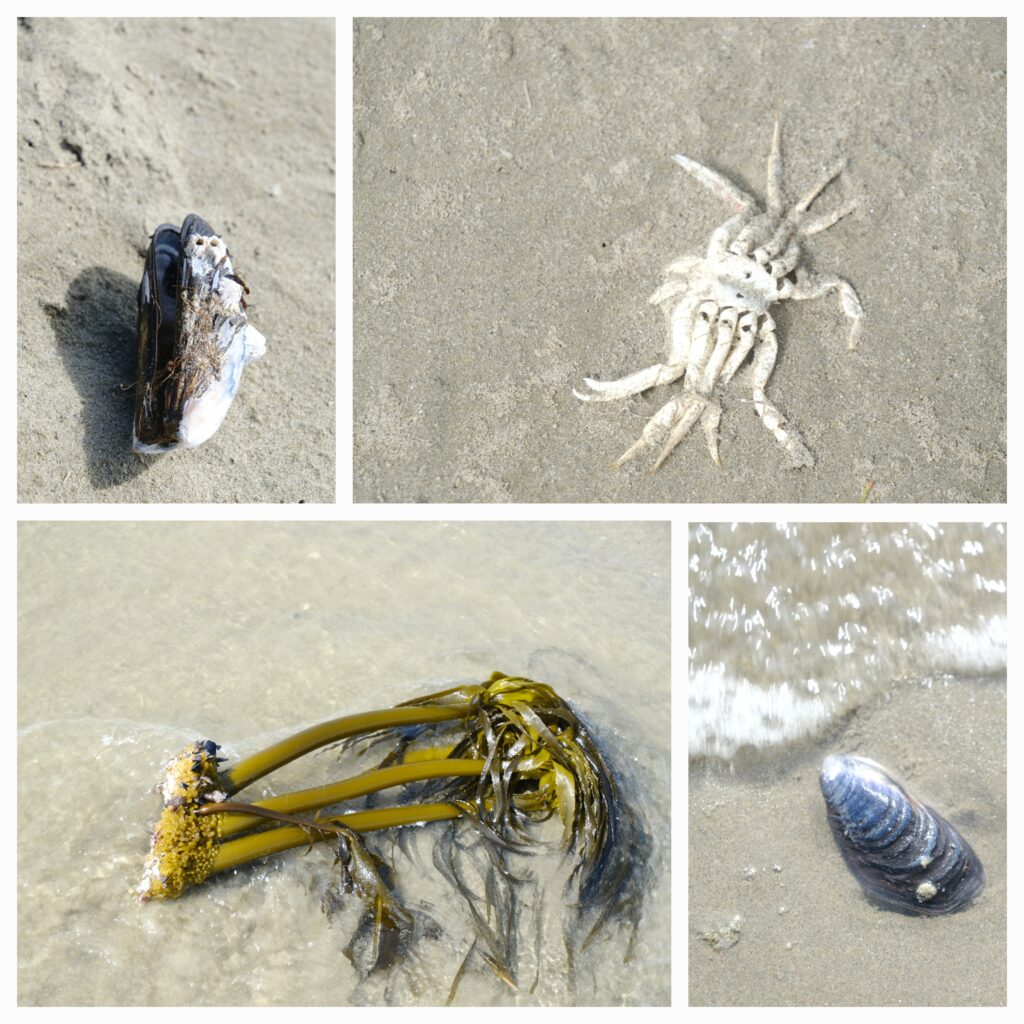 Danach geht es ab zum Strand, es war gerade Ebbe und das Meer lag im Nebel. Eine tolle Stimmung. Das Wasser war erfrischend kalt und wir untersuchten große Muscheln, Krebse und  meterlange Algen – wie große Gummipeitschen.