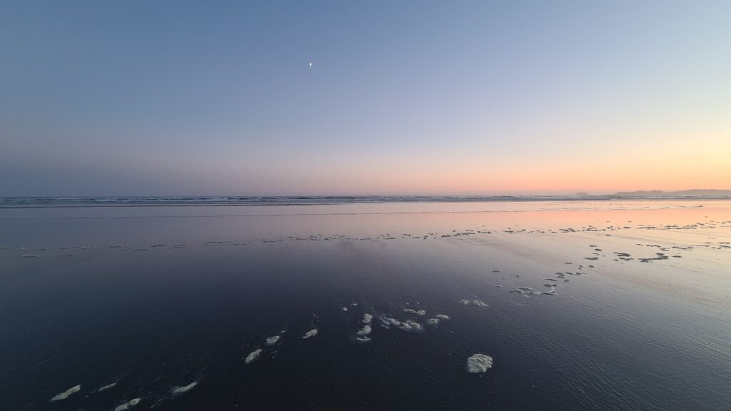Danach gings weiter zum eigentlichen Ziel, dem Regenwald mit Strand am Ozean – einem Surferparadis. Der Campingplatz liegt mitten im Wald voller Douglasien, mit Flechten überzogenen Ästen und Farnen, die total unecht aussehen (wir würden diese als künstliche Zimmerpflanze kaufen können). Wir stellen den Camper ab und machen Kaffee am riesigen Tisch.