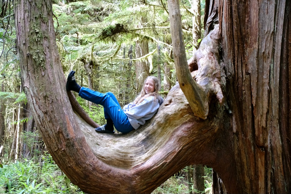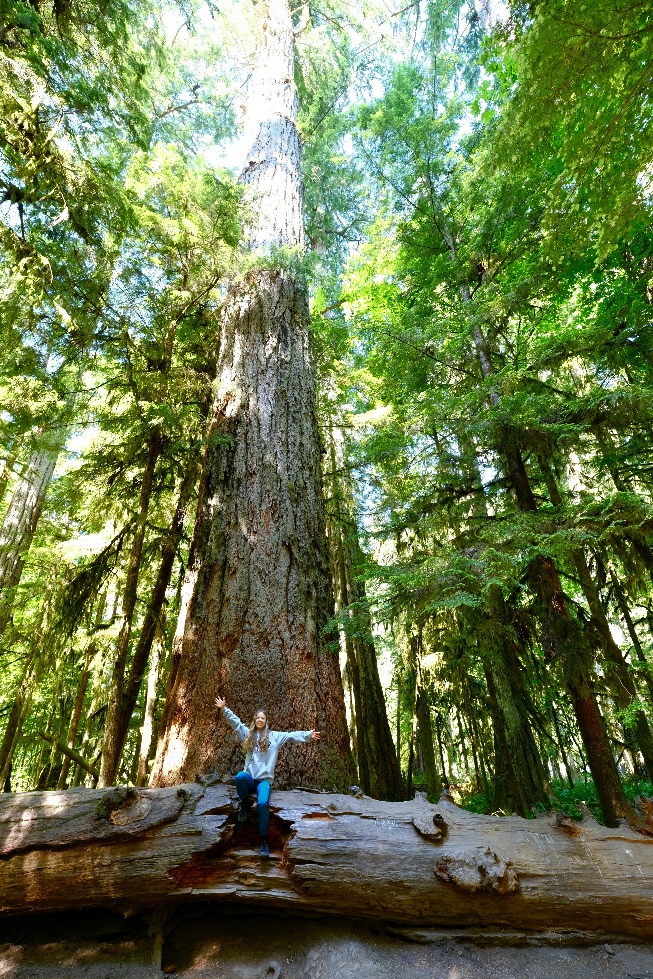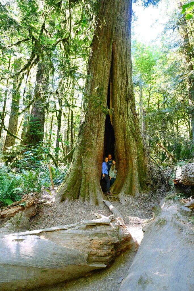 Die bis zu 800 Jahre alten und über 70 Meter hohen Douglasienbäume überragen den schiefen Turm von Pisa um einiges – der ist 56m hoch. Wie stand so schön auf einem Schild: als Christopher Columbus 1492 Nordamerika entdeckte, waren diese Bäume schon 300 Jahre alt. Die größten Exemplare haben einen Umfang von 9 Metern (wir haben locker zu 3. in einen Spalt eines Baums gepasst 😀)