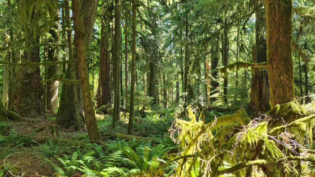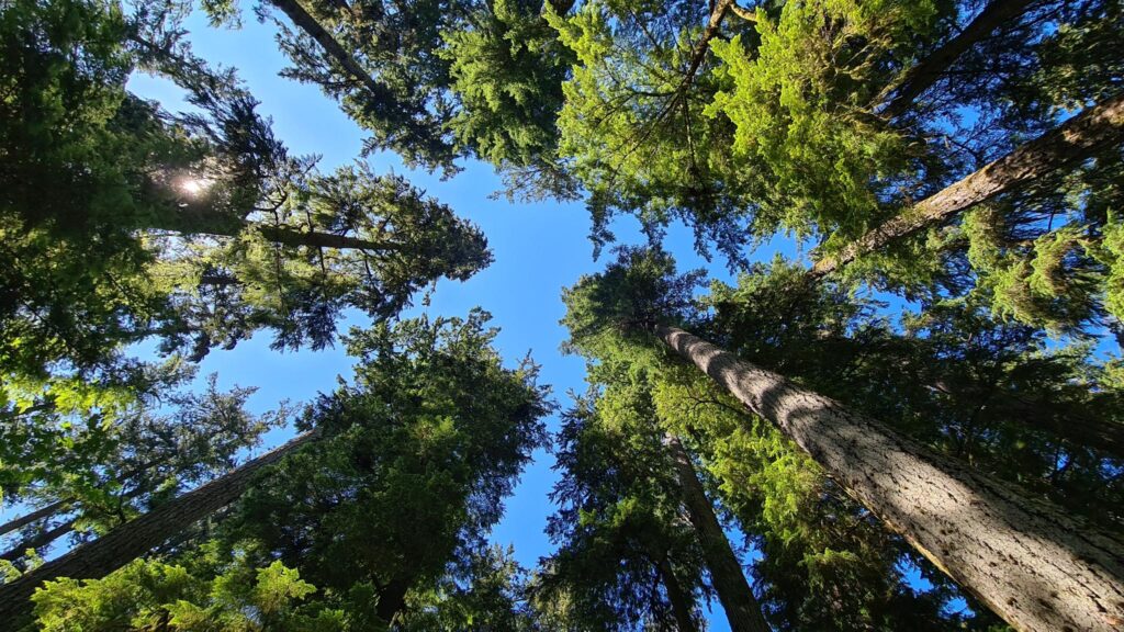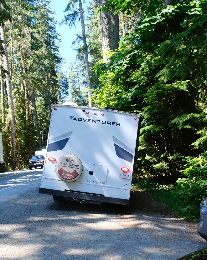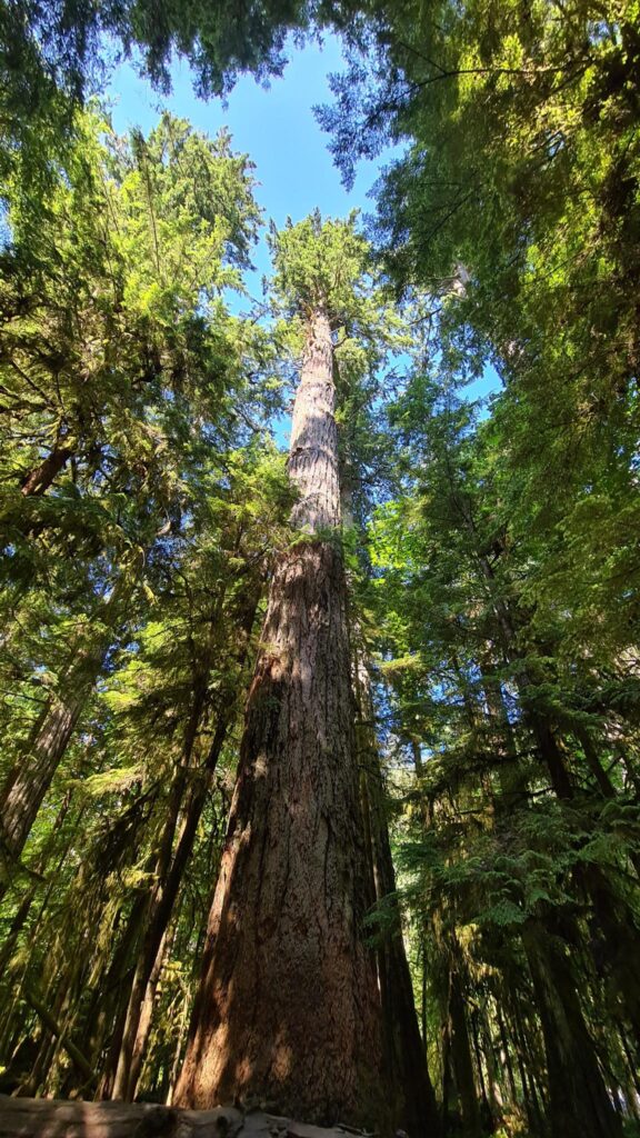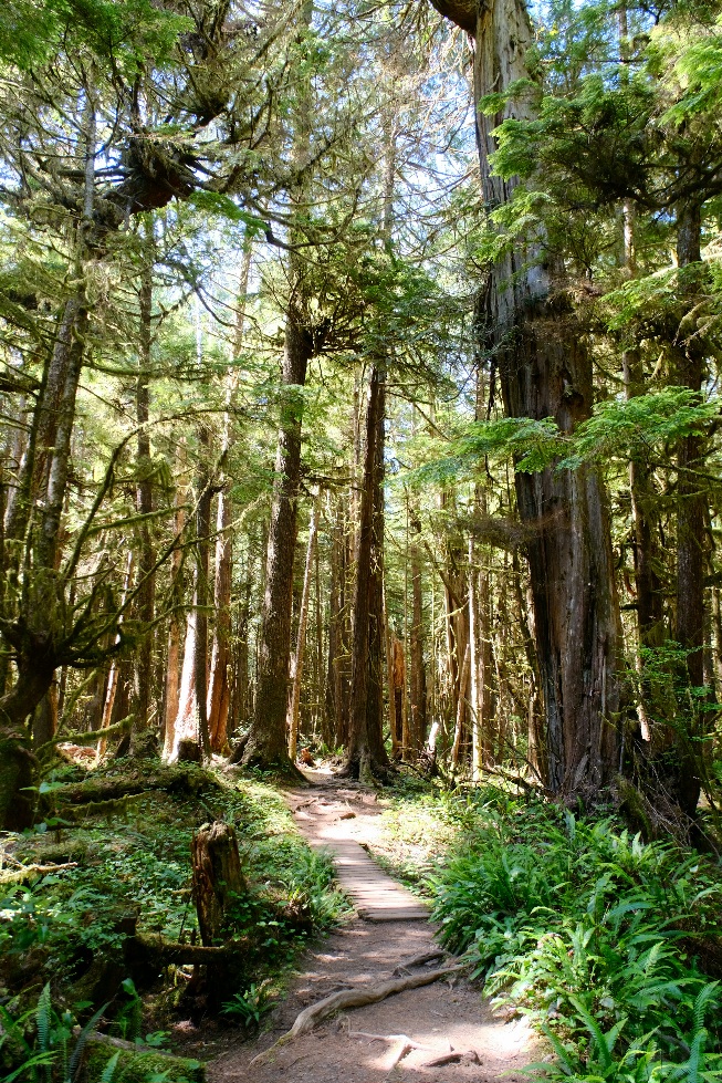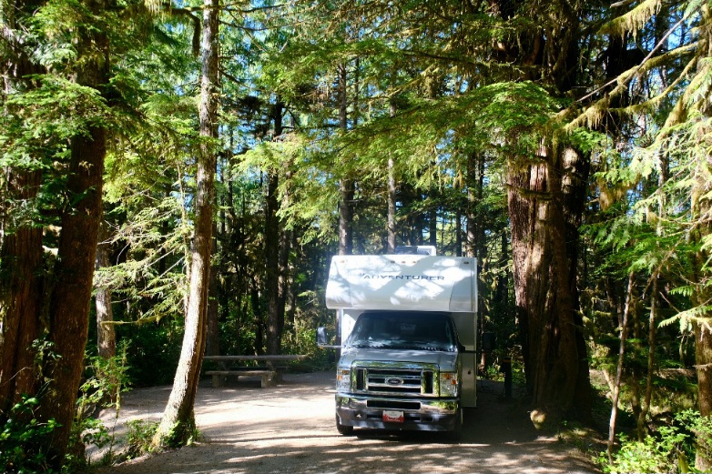 Heute haben wir uns auf den Weg zum letzten Abschnitt unserer Tour gemacht, in den Green Point Campground im Pacific Rim Nationalpark an der Westküste der Insel Vancouver Island. Dieser Campingplatz liegt aldo direkt am Pazifischen Ozean. Auf dem Weg dorthin (Dauer heute 2,5 Stunden fahrt) hielten wir noch am Cathedral Grove (Kathetralen Hain). Hier ist ein über 800 Jahre alter (Ur)waldbestand mit riesigen Küstendouglasien. Die „normalen“ Parkplätze waren bereits belegt, wir fanden nur noch einen Platz am Straßenrand, recht schräg, so dass wir Bange hatten der Camper könnte kippen. Da wir jedoch unbedingt die alten, großen Bäume sehen wollten blieben wir stehen.