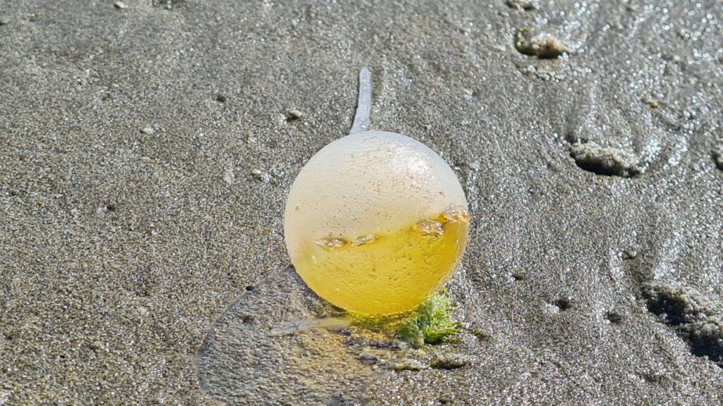 Holger ist ganz fasziniert von den vielen „Augen“ die hier auf dem Strand rumliegen, bzw. vom Wasser angespült werden. Es sind Algen, die oben wie ein Augapfel aussehen an den sich dann einen ggf. mehrere Meter langer „Sehnerv“ (der Stängel bis zum Meeresgrund) anschließt. Alles ist gummiartig und im „Augapfel“ schwabbert Wasser. 😀
