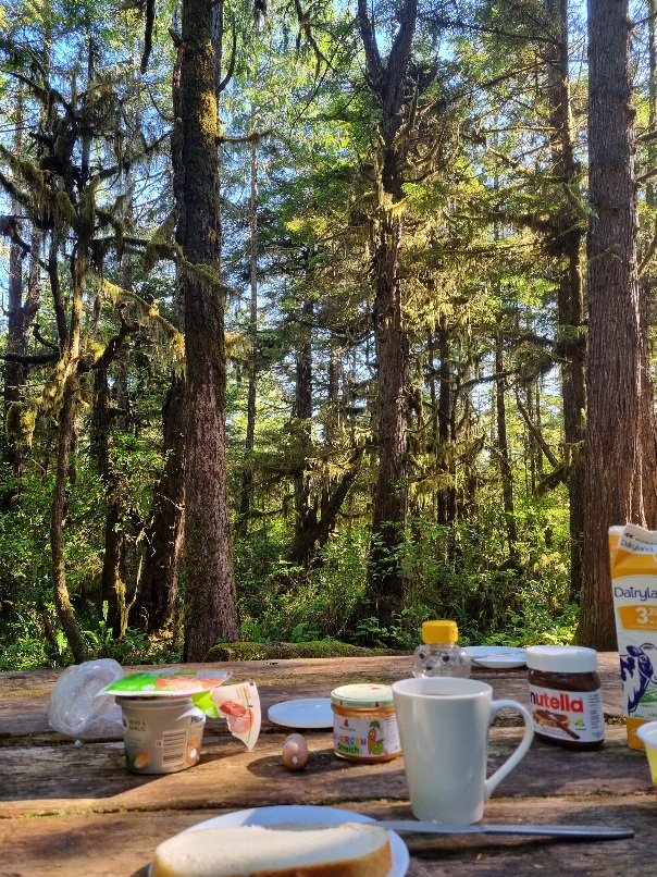 Heute war Erholung pur. Zunächst haben wir ausgeschlafen und in aller Ruhe gefrühstückt. Der Blick und die Ruhe beim Frühstück waren einfach toll -nur Bäume, Flechten und Farne um uns herum, dazu frisch gebrühten Kaffee und leckeres Weißbrot.