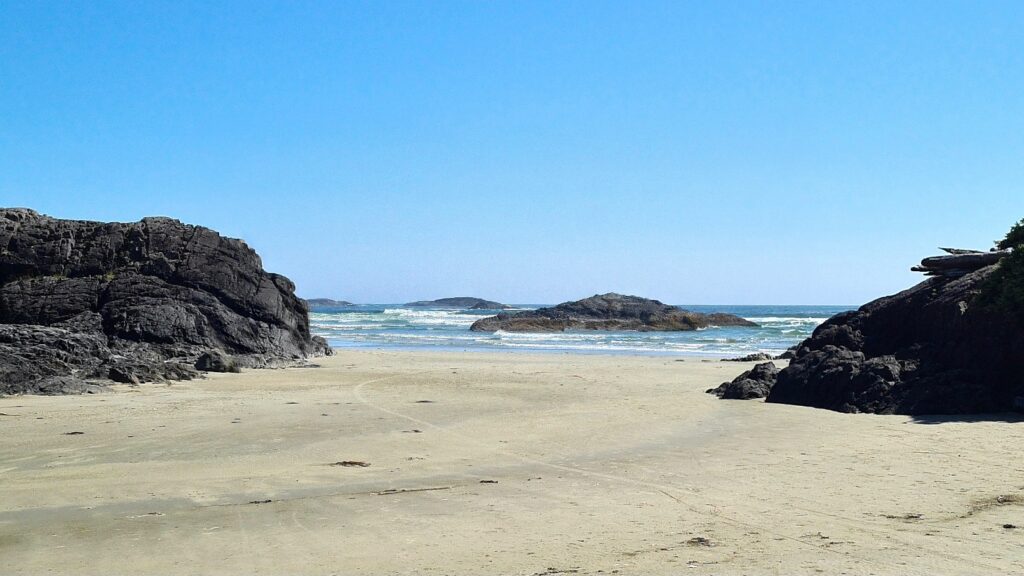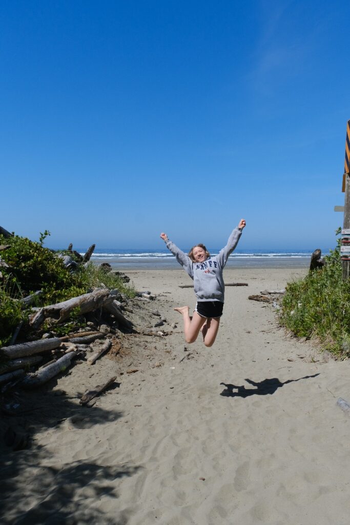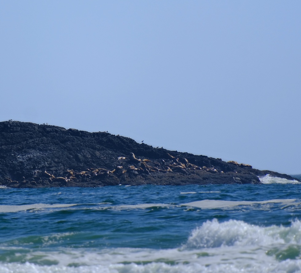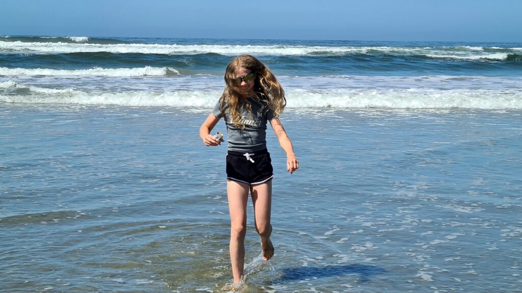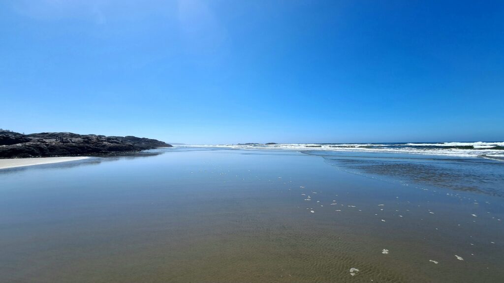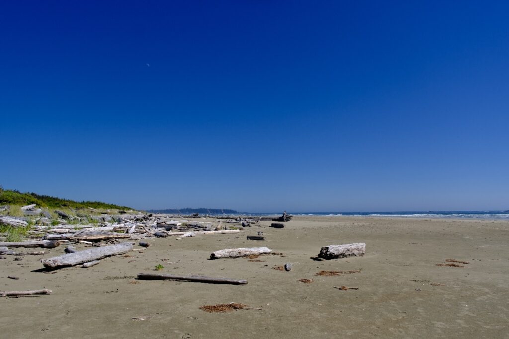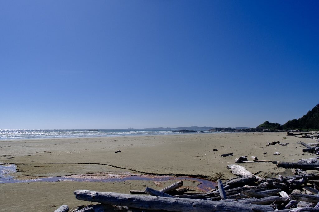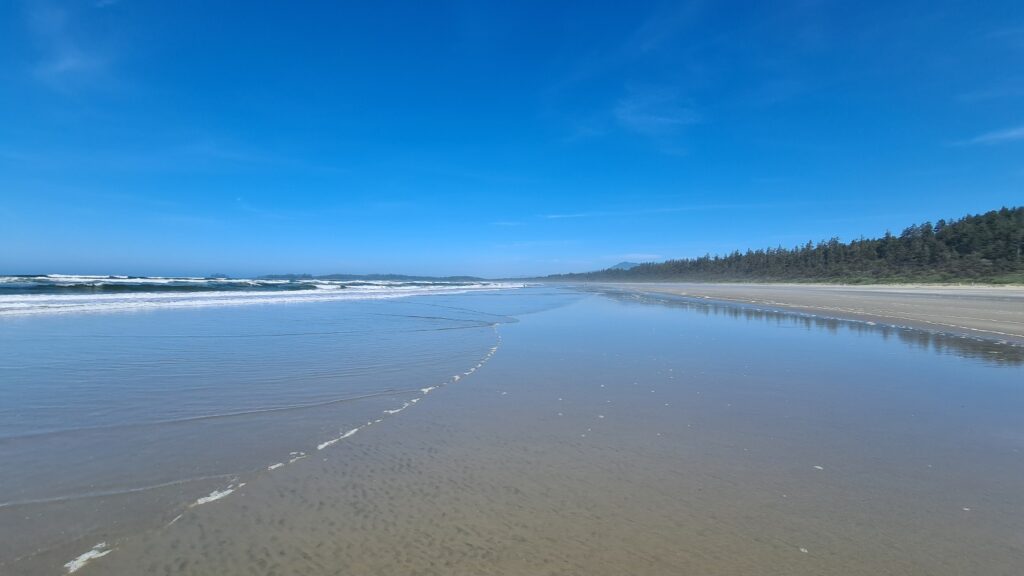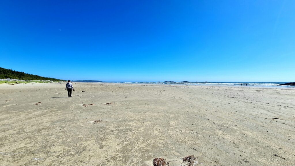 Nach dem Frühstück ging es an den Strand, heute war kein Nebel und der Strand war wieder wie leer gefegt (es gibt hier kaum Menschen am Strand). Vielleicht weil es zu kalt zum Baden ist (ein Schild warnt vor kaltem Wasser, hohen Wellen, starker Strömung und schneller Flut 😀). Eigentlich ideal für Surfer, die wir auch vereinzelt sehen, sich aber auf dem riesigen Strand verlieren. Toll das es in Kanada alles so naturbelassen bleibt und nicht mit Hotel Betonklötzen zugebaut wird.