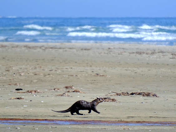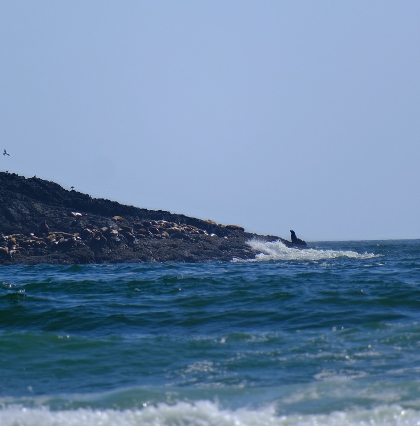 Während dessen hüpfte ein Seeotter über den Strand. Etwas von Strand entfernt gibt es eine kleine Inselgruppe aus Lavafelsen, die Seelöwen-Inseln. Hier kann man mit dem Fernglas Seelöwen beobachten (mit dem Fotoapparat nur schwierig erkennbar).