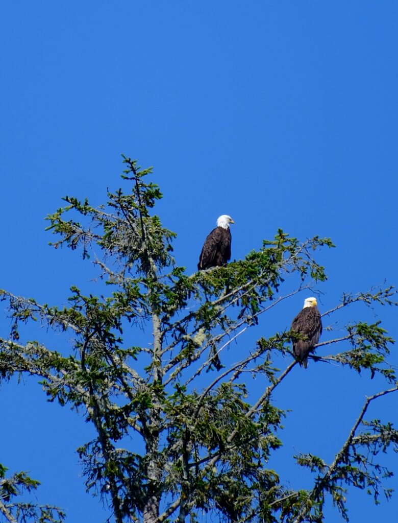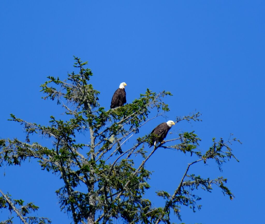 Wir beobachteten 2 Weißkopfseeadler, die es sich auf dem höchsten Baum bequem gemacht haben und dort einige Zeit verweilten.