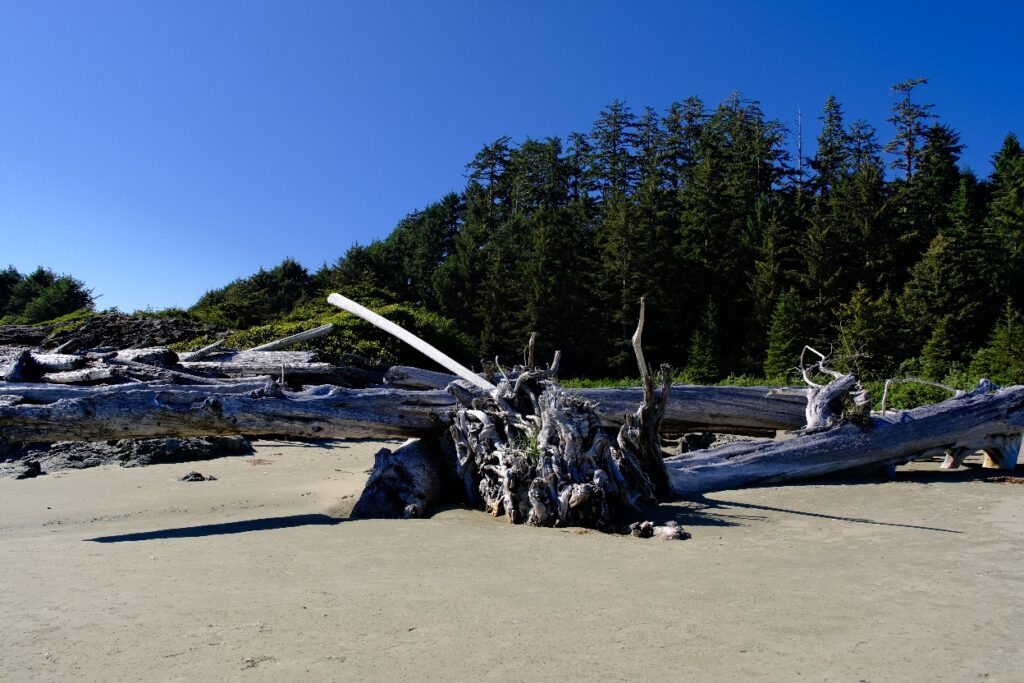 Am Nachmittag haben Holger und ich noch einen Spaziergang zu einem anderen Strand gemacht, dieser war auch menschenleer. Hier wurde vor langer Zeit viel Holz angeschwemmt, teils riesige Stämme liegen dort.