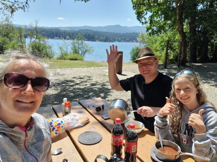 Dann ging es ein paar Kilometer weiter bis zum Sproat Lake. Hier machten wir Mittag. Ich habe mit Mariella fix eine Suppe im Camper warm gemacht und dann sind wir mit Topf, Schüsseln und Löffeln bepackt zum Picknicktisch am See gelaufen und haben zu 3 den Ausblick genossen und Süppchen gegessen.