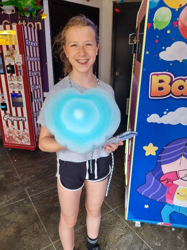 Mariella probierte einen Zuckerwattenautomaten aus. Hier konnte sie verschiedenste Formen und Farben wählen und entschied sich für ein türkiesenes Zuckerwattenherz. Dem Automaten konnte man dann bei der Herstellung zuschauen.