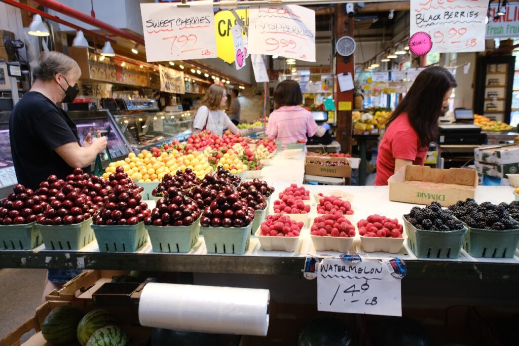 Nach dem Fußmarsch stiegen wir in den nächsten Bus und ließen uns zum Granville Island bringen. Eine kleine Halbinsel im Stadtzentrum auf der es neben allerlei Geschäften einen großen Markt gibt. Hier werden frisches Obst und Gemüße sowie Fleisch, Fisch und verschienste Backwaren aus der Region angeboten. In diesem Bus hatten wir einen sehr guten Guide, den wir super verstanden haben. So konnten wir doch noch einige interessante Dinge erfahren.