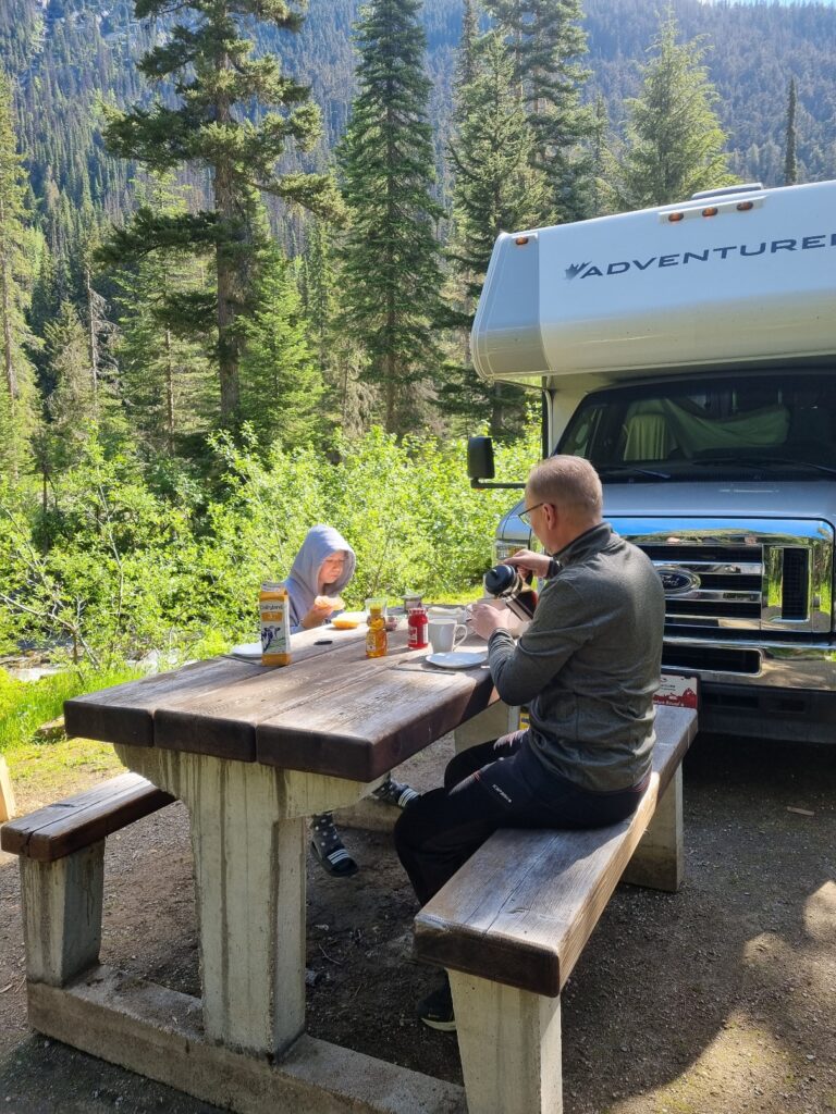 Guten Abend nach Deutschland. Bei uns ist es gerade 19Uhr und wir sitzen frisch geduscht im Camper und faulenzen etwas. Heute haben wir überraschend etwas länger geschlafen und sind erst 8.45 aufgestanden. Es war so warm, dass wir am Picknicktisch draussen frühstücken konnten, sehr gemütlich.