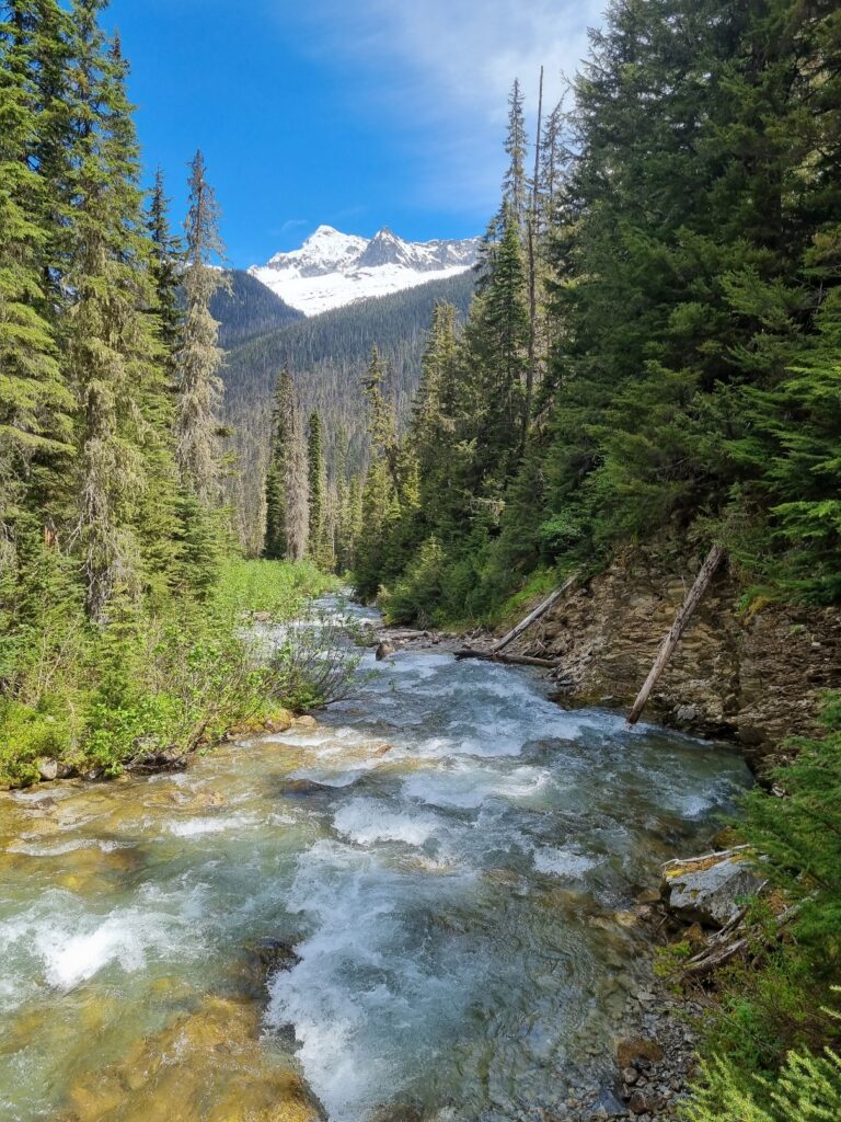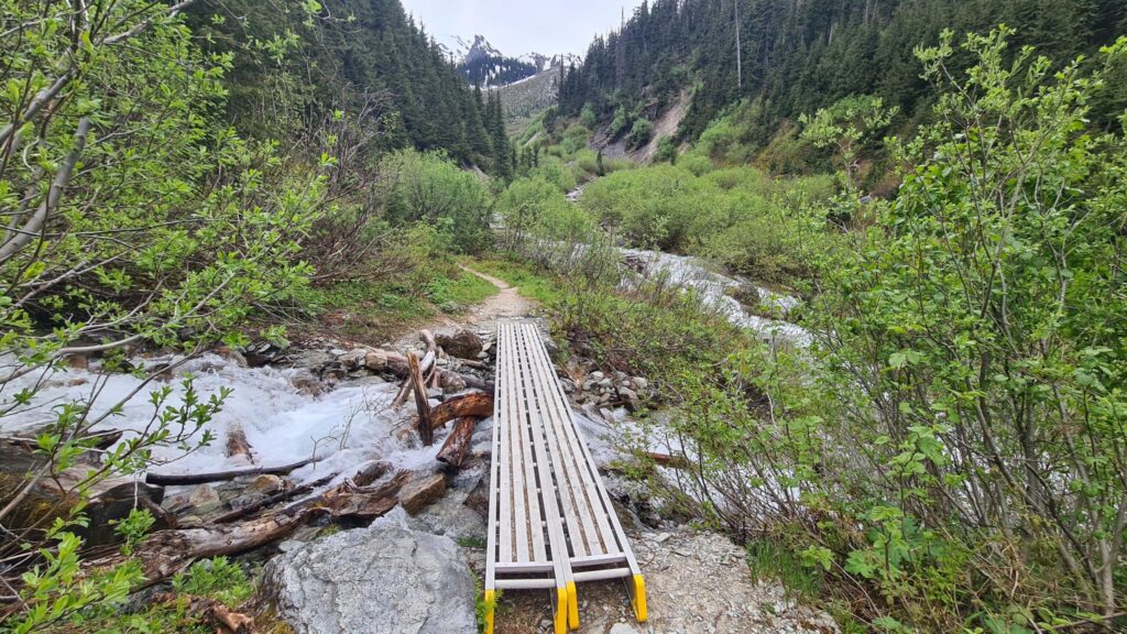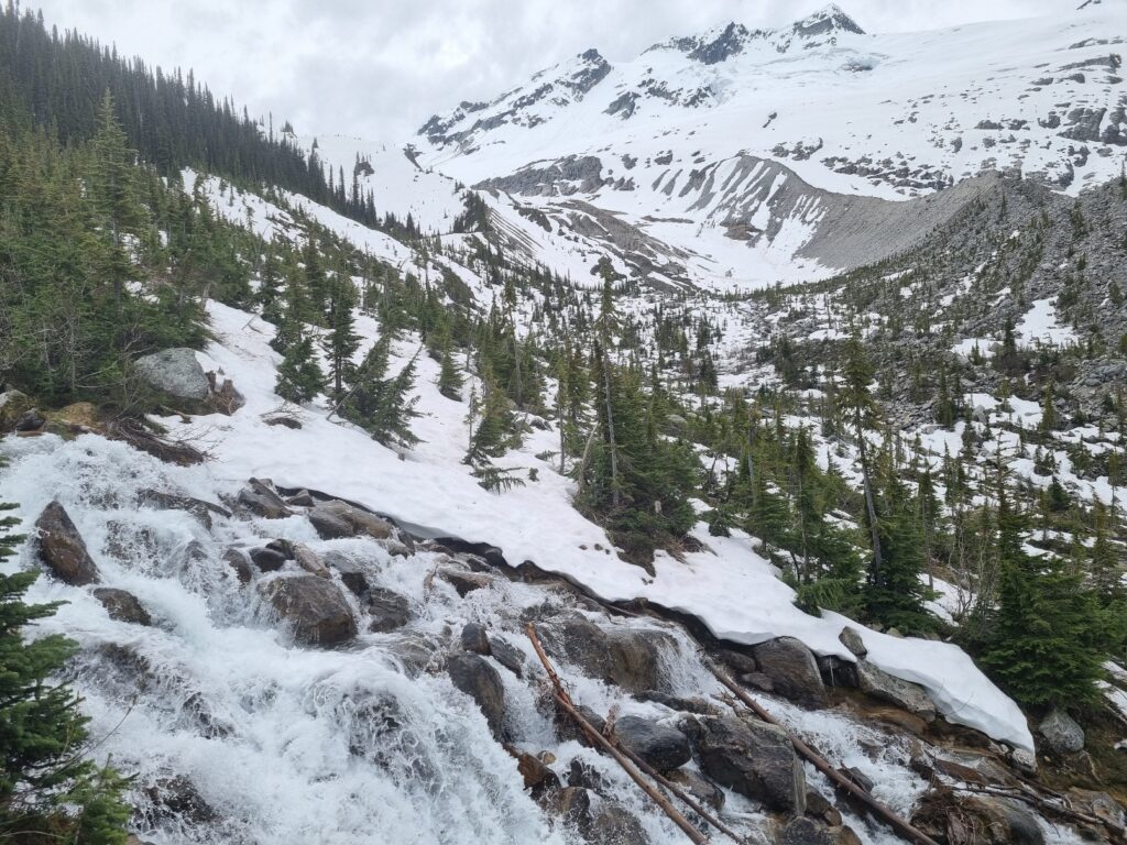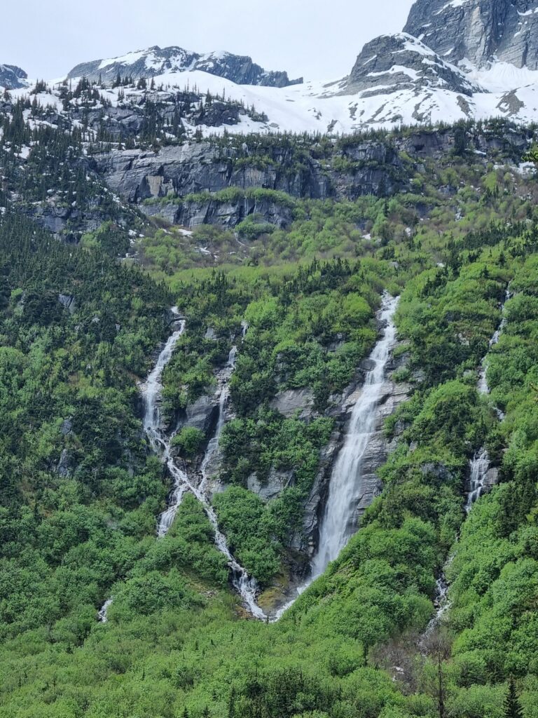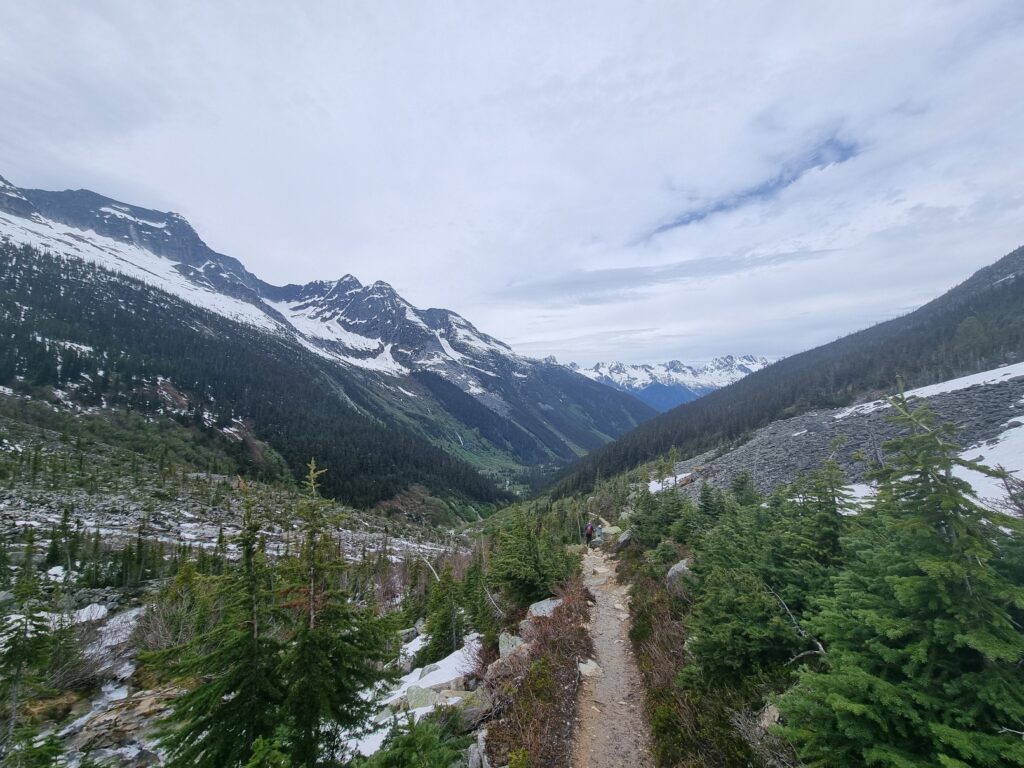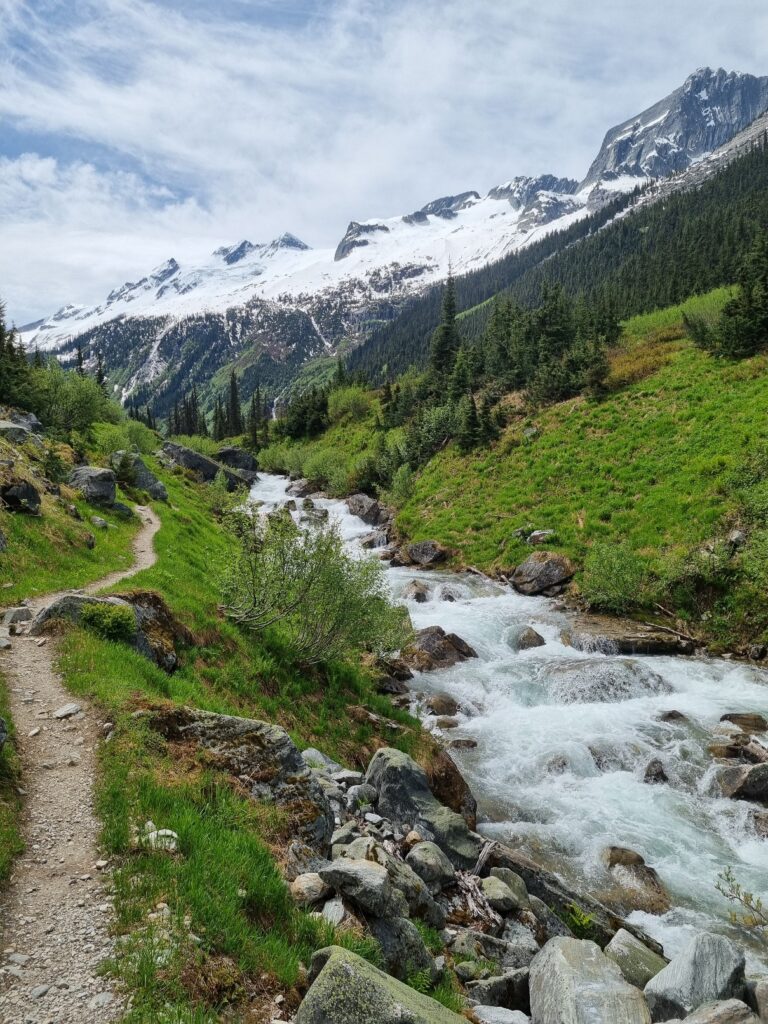 Wir erkundigen uns noch welche Wanderung zu empfehlen ist,denn aufgrund des „späten“ Frühlings sind viele Wanderwege noch mit Schnee bedeckt. Wir liefen den Asulkan Valey. Laut Plan sind es ca 16km und es geht 870Höhenmeter nach oben. Laut der netten Dame am Info-Häuschen werden wir wahrscheinlich nicht bis zum Ende kommen, da uns auch hier Schnee erwarten wird. Ein Teil der Brücken wurden erst vor einer Woche von den Park Rangern installiert. Gegen 11Uhr liefen wir los durch ein tolles Tal mit vielen Wasserfällen, tollen Ausblicken und einer erwachenden Natur (die Weidenkätzchen kommen gerade raus, die Farne sind teilweise noch zusammen gerollt und alles ist frisch grün). Wie auch auf unserer Tour gestern, sollten wir wieder auf Bären acht geben, also sangen wir, redeten laut und machten lustige Geräusche. Wahrscheinlich nahmen die Bären deswegen reißaus. Der Weg zog sich recht lang durch das Tal und wurde gegen Ende recht schweißtreibend.