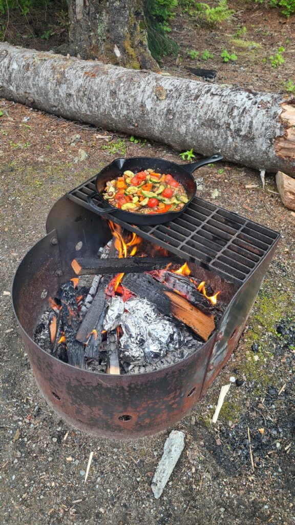 Wir schnappten uns fix noch ein paar Holzscheite fürs Lagerfeuer. Trotz Regen machte Holger Lagerfeuoer und es gab Grillkartoffeln mit Grillgemüse.