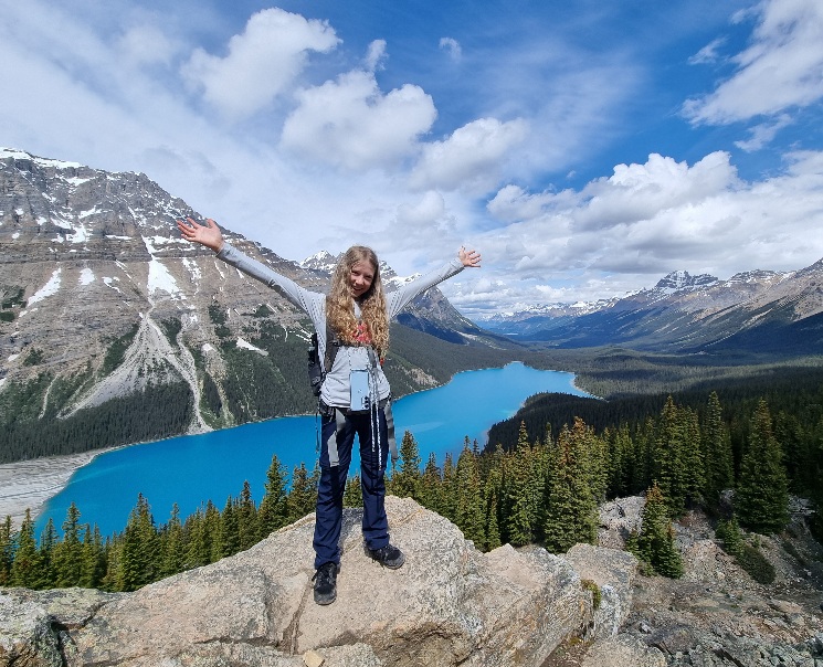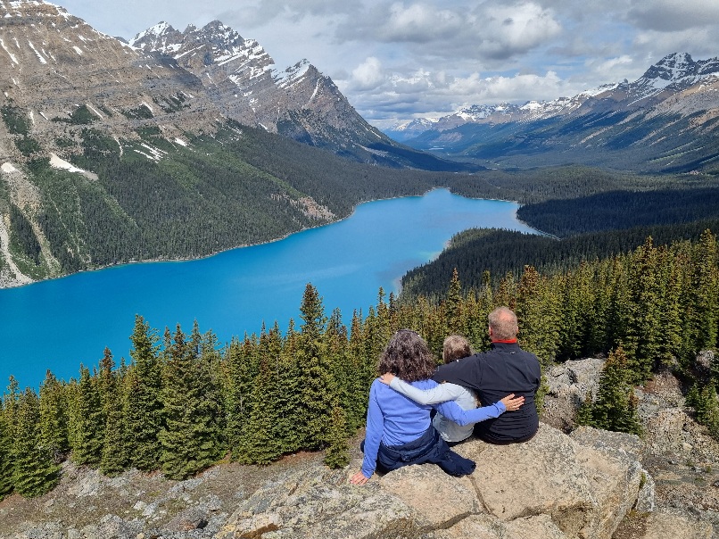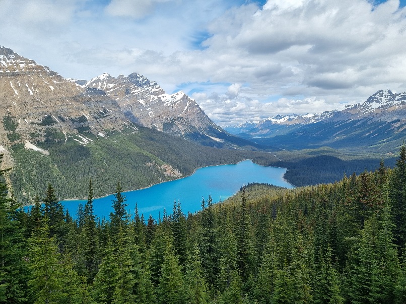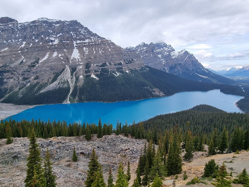 Puh….Wo soll man nach so einem Tag beginnen zu schreiben. Am besten von vorn. Nach den regnerischen Wettervorhersagen für morgen haben wir unseren Plan ein bisschen umgebaut und haben das morgige Ziel auf heute vorgezogen. Damit ging es heute zum 1.Teil des Icefield Parkways. Dies ist eine beeindruckende Panoramastraße durch die Rocky Mountains. Der Wecker klingelte 6Uhr, Abfahrt war 7.30 und 9Uhr kamen wir am Hauptziel, dem Peyto Lake an. Er ist für seine Farbe, seine traumhafte Lage und seine Form bekannt. Er hat von oben gesehen Ähnlichkeit mit einem Kojoten.