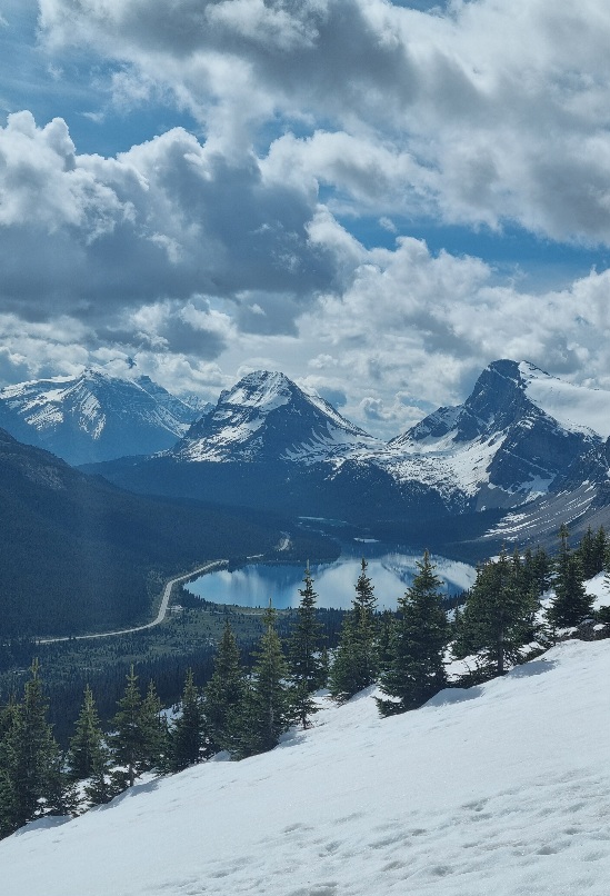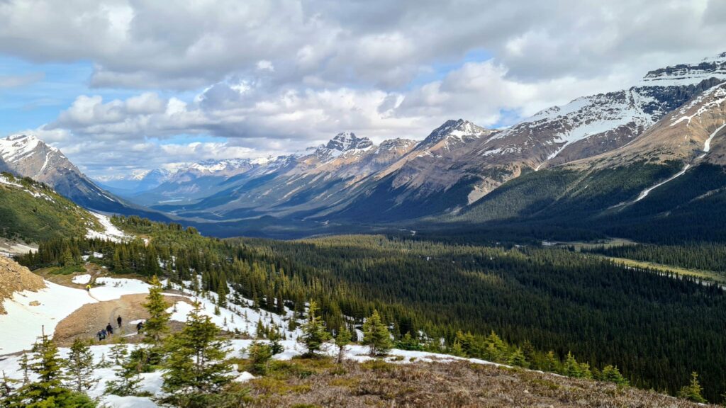 Holger wollte noch zu einem weiteren Aussichtspunkt, etwas Abseits von den Touristen – also auf gehts. Den Abzweig zum Aussichtspunkt haben wir aber verpasst und sind auf dem Wanderweg zum Bow Summit gelandet. Dieser war insgesamt 6km lang und ging teilweise durch Schnee und Matsch, am Ende wurden wir dafür mit einem wahnsinnigen Ausblick auf den Bow Lake und die umliegenden Berge belohnt. Wir genossen und genossen und genossen.