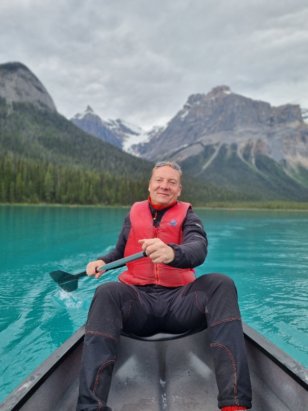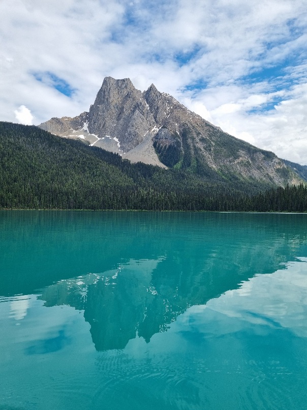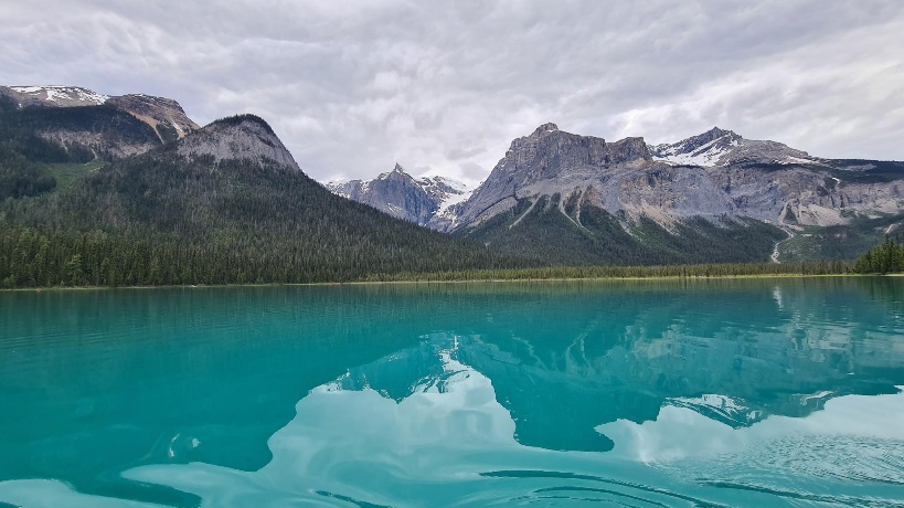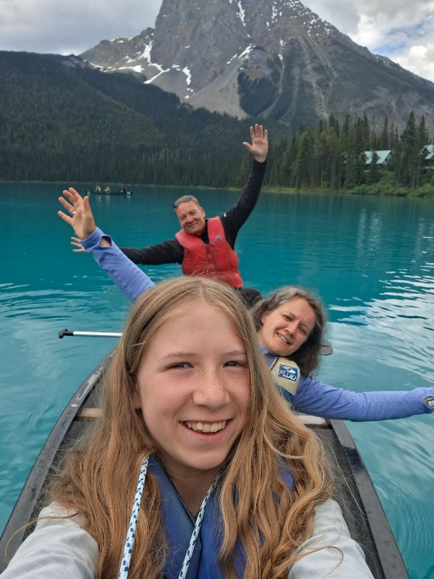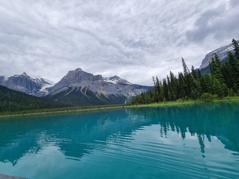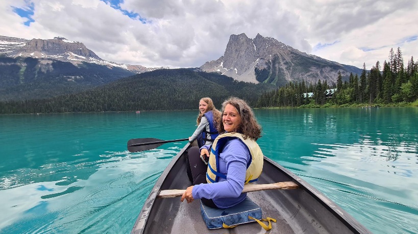 Auf dem Weg zum Campground beschlossen wir doch noch einen kurzen Abstecher zum ursprünglich geplanten Ziel des Tages zu machen: den Emerald Lake. Dieser See ist auch ein Touristenmagnet und wir hofften mit einer Ankunft am späten Nachmittag, dass vielleicht der Hauptandrang durch ist und wir Glück haben einen Parkplatz zu ergattern. Auf dem Weg gab es aber direkt wegen Überfüllung eine Strassensperre die jedoch kurz vor uns aufgehoben wurde. Einen Parkplatz für den Camper fanden wir ganz oben am See und Holger parkte das riesige Gefährt seitlich zwischen zwei andere Camper ein. Am See angekommen sahen wir schon wieder viele Leute. Es gab die Möglichkeit zum Kanu fahren. Für 100$ pro Stunde (ca 70€) nicht ganz günstig, aber wann macht man sowas schon nochmal. Also stellten wir uns an und haben das vorletzte Kanu bekommen, danach war Feierabend am Bootsverleih für heute. Mariella und Holger paddelten und wir liesen die Seele baumeln und bestaunten die Farbe des Wassers und die umliegenden Berge, die sich im Wasser spiegelten. Wir waren völlig begeistert von unserem Glück des heutigen Tages. Was da nicht alles reingepasst und geklappt hat. So viel Kanada…