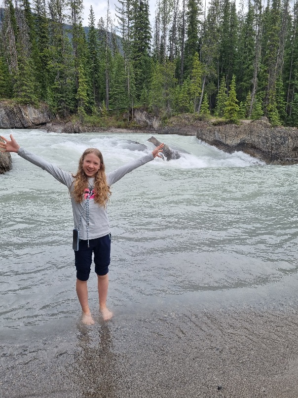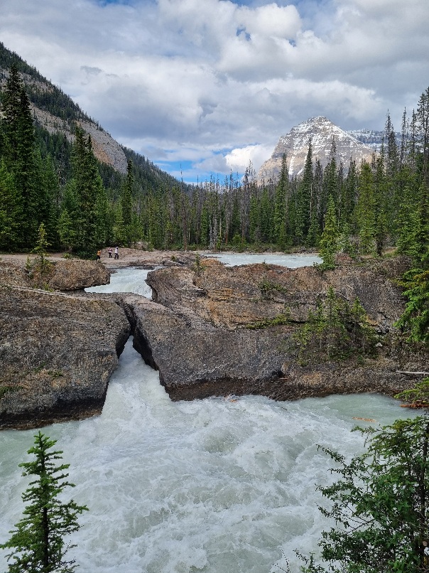 Auf dem Rückweg hielten wir noch kurz an der Natural Bridge, eine natürlich zusammengefügte Brücke aus Steinblöcken, durch die der Kicking Horse River tost. Theoretisch könnte man den Fluss darüber überqueren.