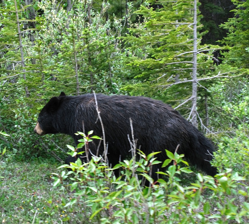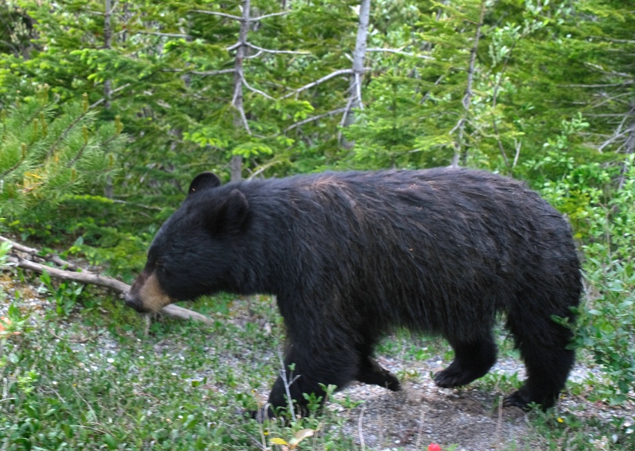 Völlig geplättet von den Eindrücken gings wieder zum Parkplatz zurück und hier war jetzt mächtiges Gedränge. Unser Camper wurde vorne zugeparkt und Holger hatte Bedenken rückwärts gut rauszukommen. Wir wollten die Situation abwarten und kochten uns erstmal im Camper ein Mittagssüppchen. Es ist schon von Vorteil wenn man alles was man braucht mit sich herumfährt. Nach dem Mittag besserte sich die Situation nicht und Holger rangierte unter meinem wilden Armgefuchtel den Camper aus der Lücke. Da wir morgen sowieso nochmal diese Strecke fahren, beschlossen wir uns auf den Rückweg zu machen, um nochmal am Bow Lake anzuhalten. Wir fuhren den Icefield Parkway wieder zurück und Holger entdeckte einen Schwarzbären am Strassenrand. Dieser trottete seelenruhig vor sich hin. Ich schoss fix ein paar Fotos durchs offene Fenster und dann fuhren wir völlig begeistert von den heutigen Erlebnissen weiter.