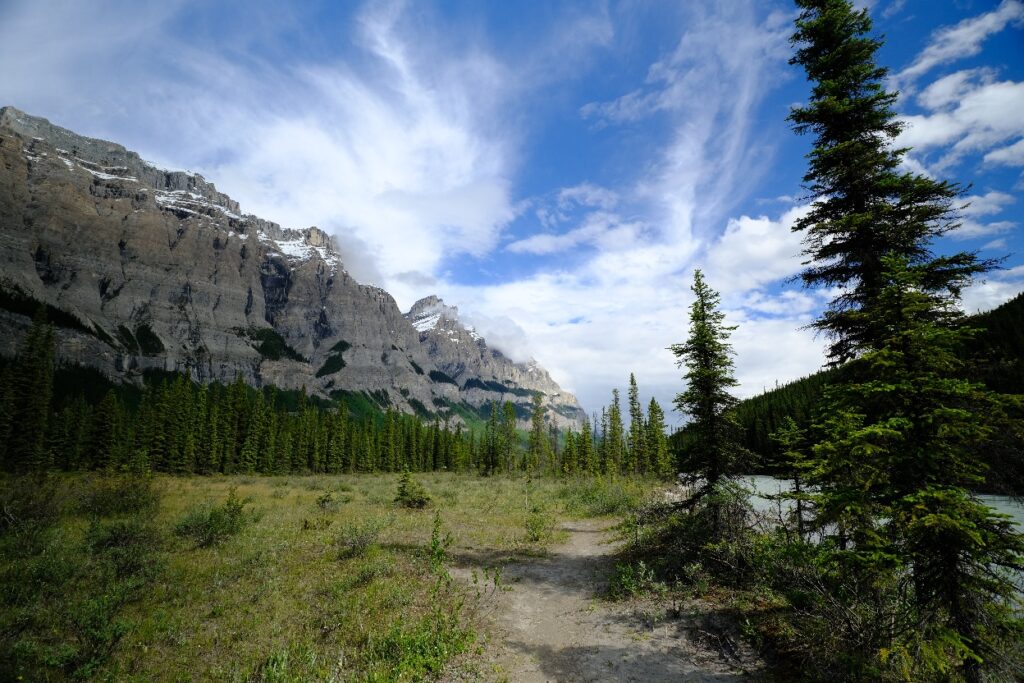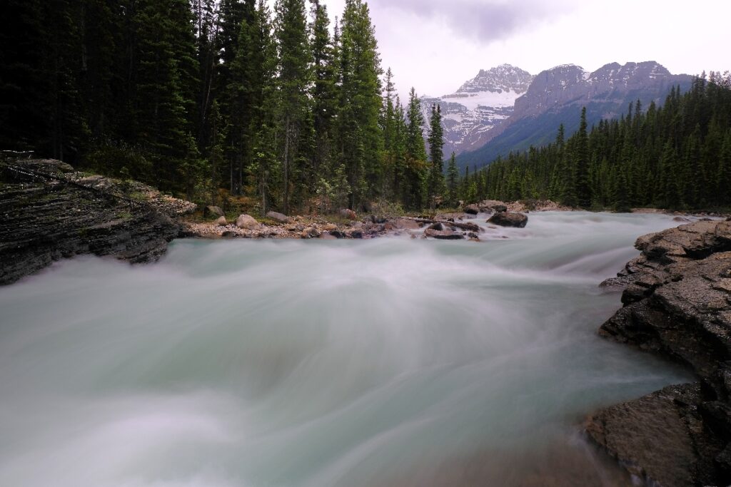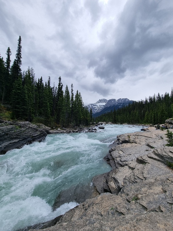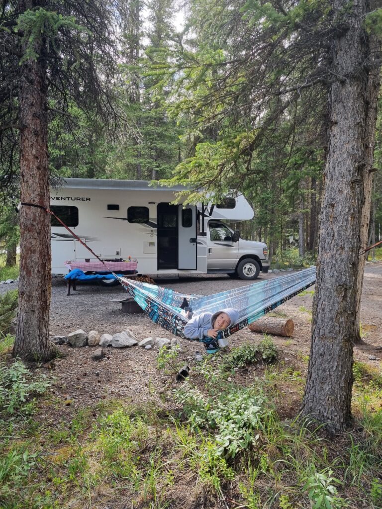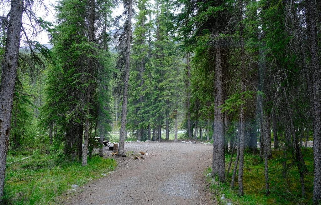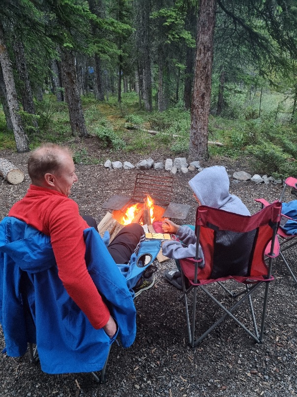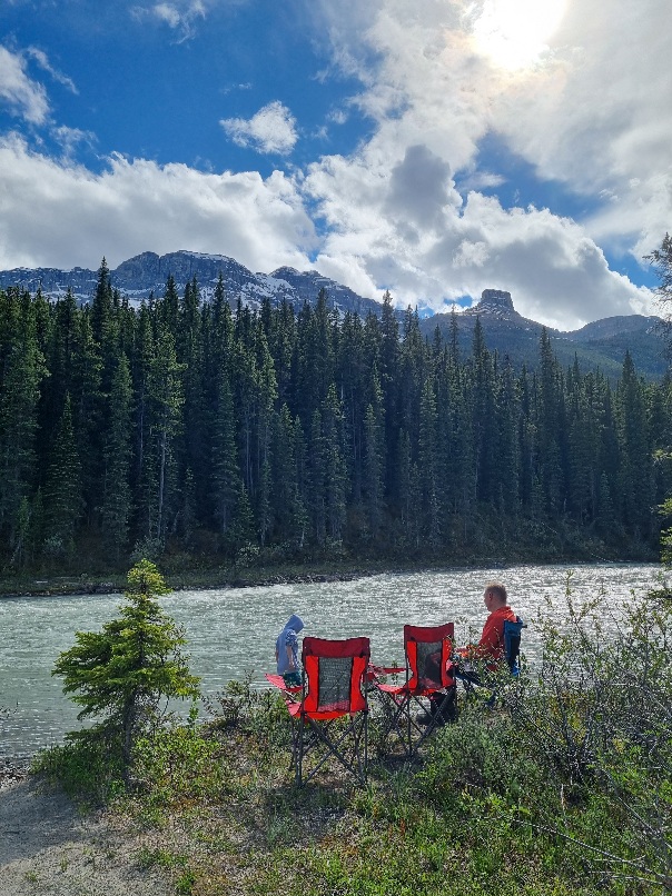 Der Rampart Creek ist ein ganz einfacher Campingplatz, aber herrlich ruhig im Wald am Saskatchewan River gelegen. Nach ein wenig Kurbeln hat Holger den Vamper gut platziert und wir genossen den restlichen Tag auf unserem Platz und am Fluss, der nur 20m von unserem Stellplatz entlang fließt.