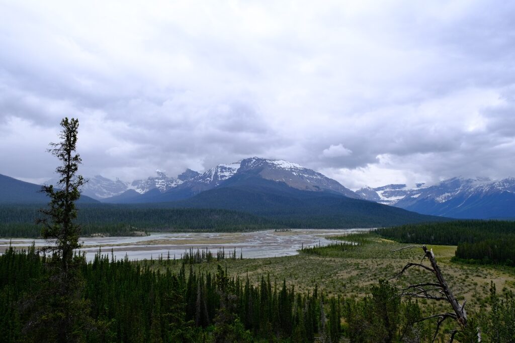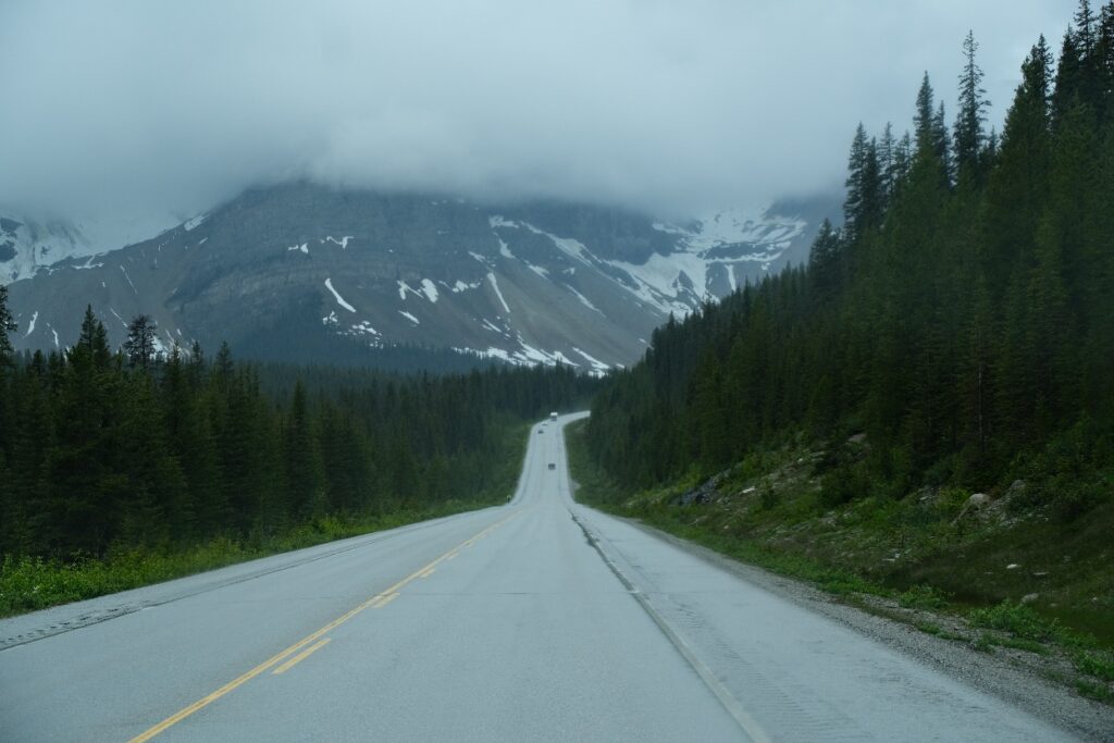 Der heutige Tag startete mit sanften Getröpfel aufs Dach des Campers. Der Wetterbericht hatte also die richtige Vorhersage gemacht. Wir ließen unsviel Zeit beim Frühstück und machten uns erst gegen 10.30 los. Nach dem Dumpen (Entleeren aller Abwassertanks, Auffülen von Wasser), Tanken und noch kleinen Einkäufen gings wieder auf den Icefields Parkway. Die Sicht war mäßig und es regnete ganz ordentlich. Wir waren froh diesen Abschnitt gestern schon abgefahren zu haben.